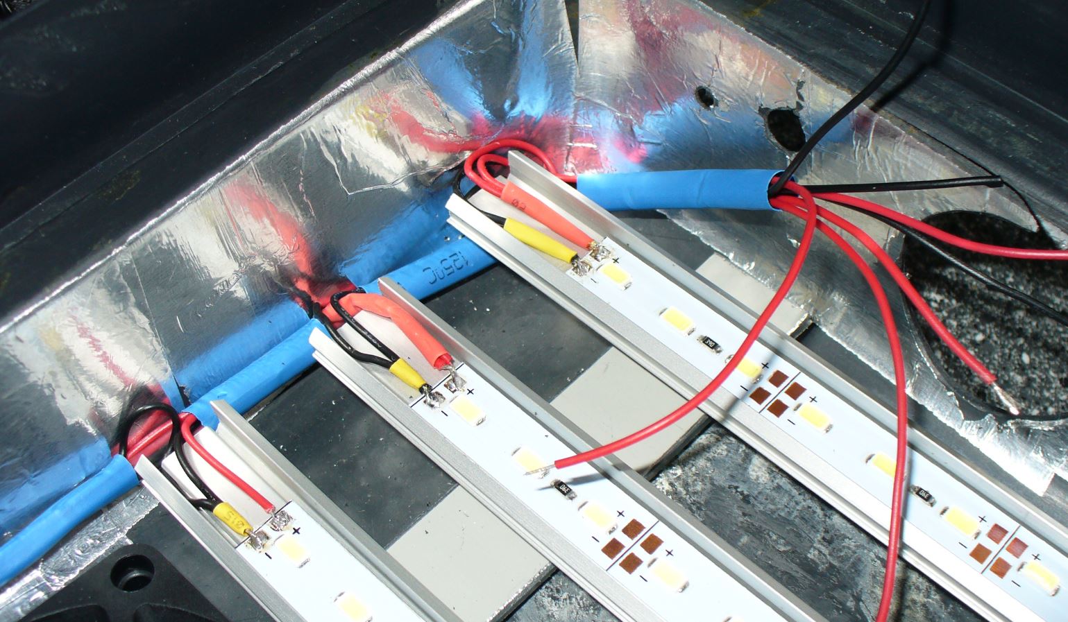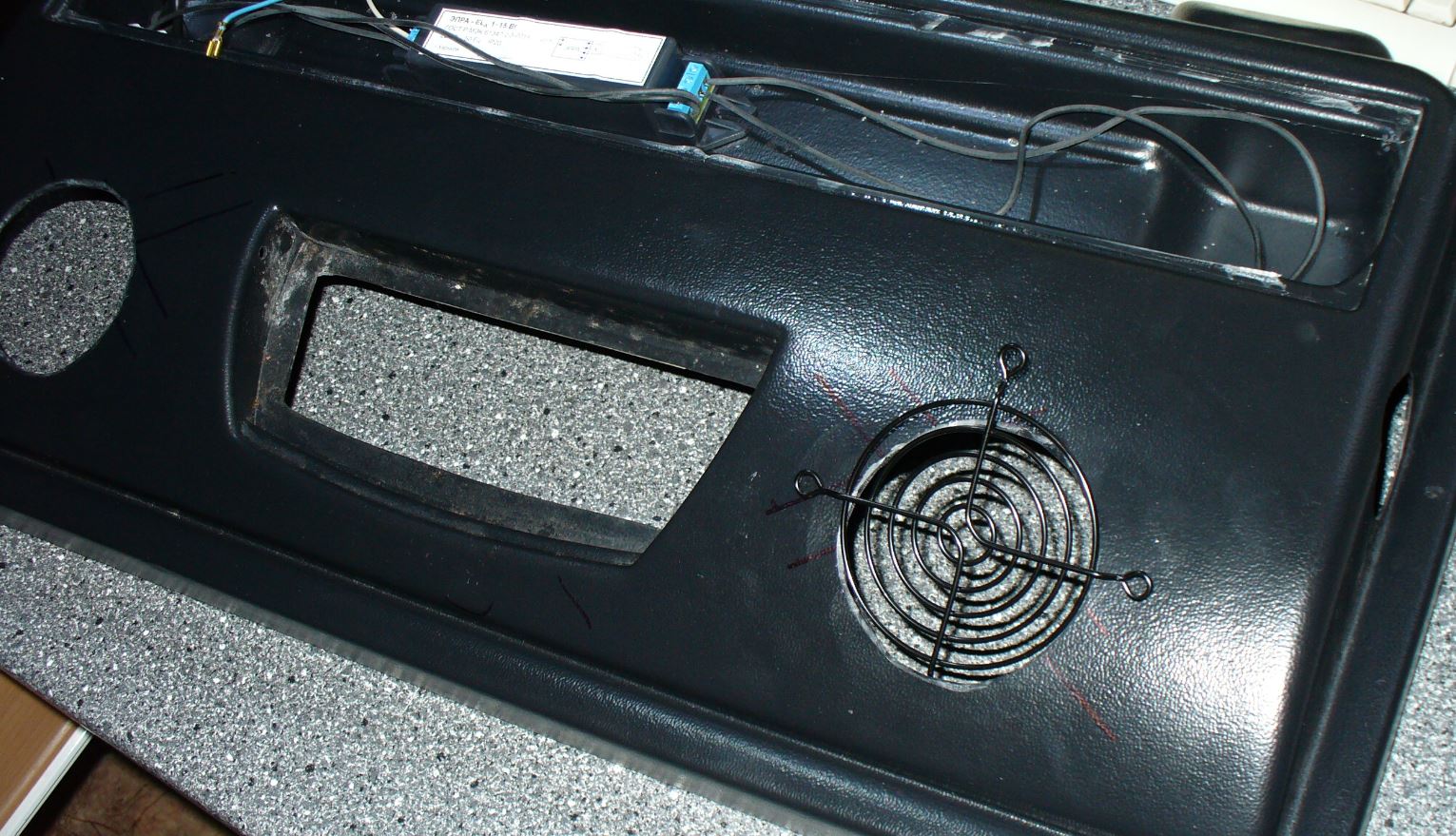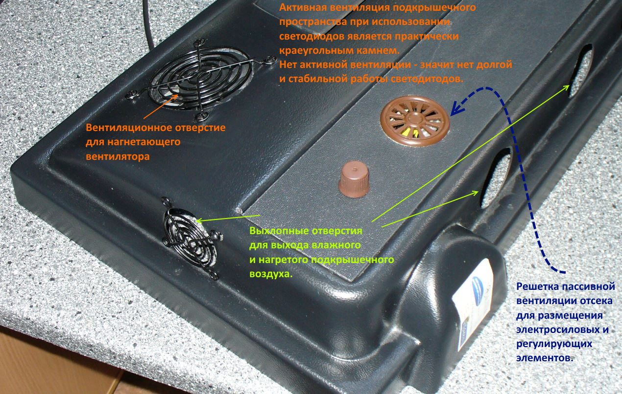 Внутренности отсека - штатного "пуза" - в котором расположились все электрические элементы обеспечивающие работу светодиодов, люмлампы и вентиляторов охлаждения.