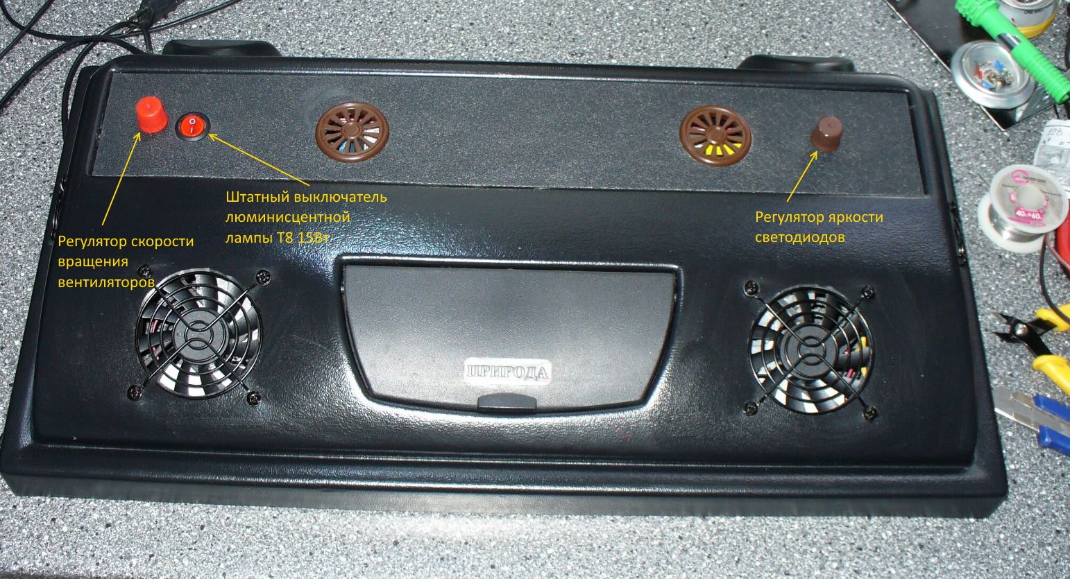 Сверху будут только выключатели и ручки потенциометров для регулировки скорости вращения вентиляторов и диммирования светодиодов.