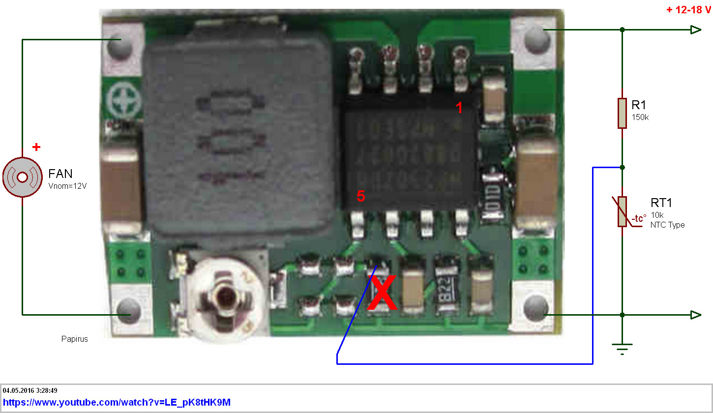 - минимальная скорость (т.е. напряжение при которой вентилятор еще крутится ~ 3.5-4 Вольта) достигается при температуре на датчике 25-26 градусов - если температура ниже, то двигатель вентилятора останавливается;