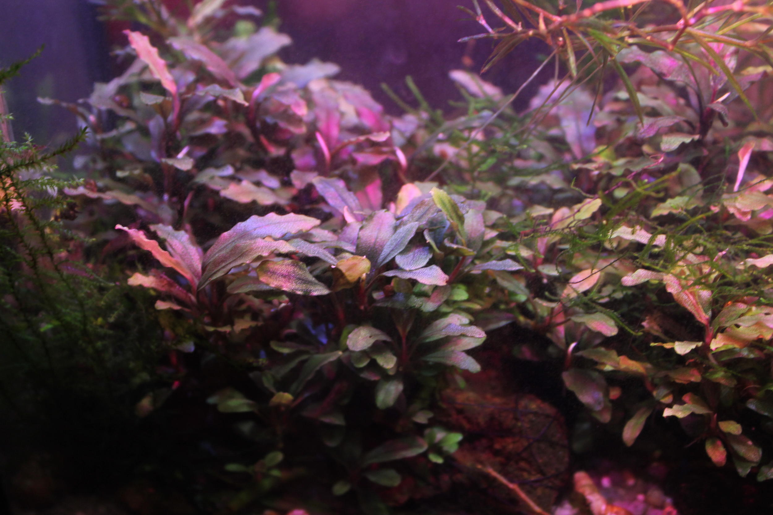 Как-то попали в мои руки кучка буцефаландр. Растения были потрепаны в борьбе с водорослями, в общак сажать их не стал, а приспособил под них 12 литровый аквариум в тумбе под основным. Грунт - кварц 2-3мм, свет - 1Вт дешевые светодиоды (7 шт, 6000К, 8000К, full), свечу с дневной паузой, грелка 10Вт (акваэлевская, стеклянная, без терморегулятора, жаль, уже не выпускают). Население - 6 вишневых барбусов, десяток неокаридин и сегодня запустил пяток эндлеров. Вода, - мешаю с осмосом. Подмениваю не регулярно, 1.5 литра примерно раз в месяц. Водорослей не наблюдаю. Стекла чищу раз в пару месяцев.Условия спартанские, но растения постепенно принялись и пошли в рост. Дизайном не пахнет, чисто техническая баночка.