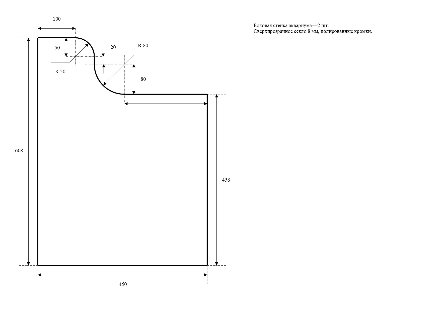 Cверхпрозрачное стекло (Оптивайт) 8 мм передняя (см. рис 4) и боковые стенки (см. рис 3); тонированное стекло 8 мм задняя стенка (см. рис 6), протравленное после сверления отверстий (хочу минимизировать риски разрушения от просверленных отверстий).