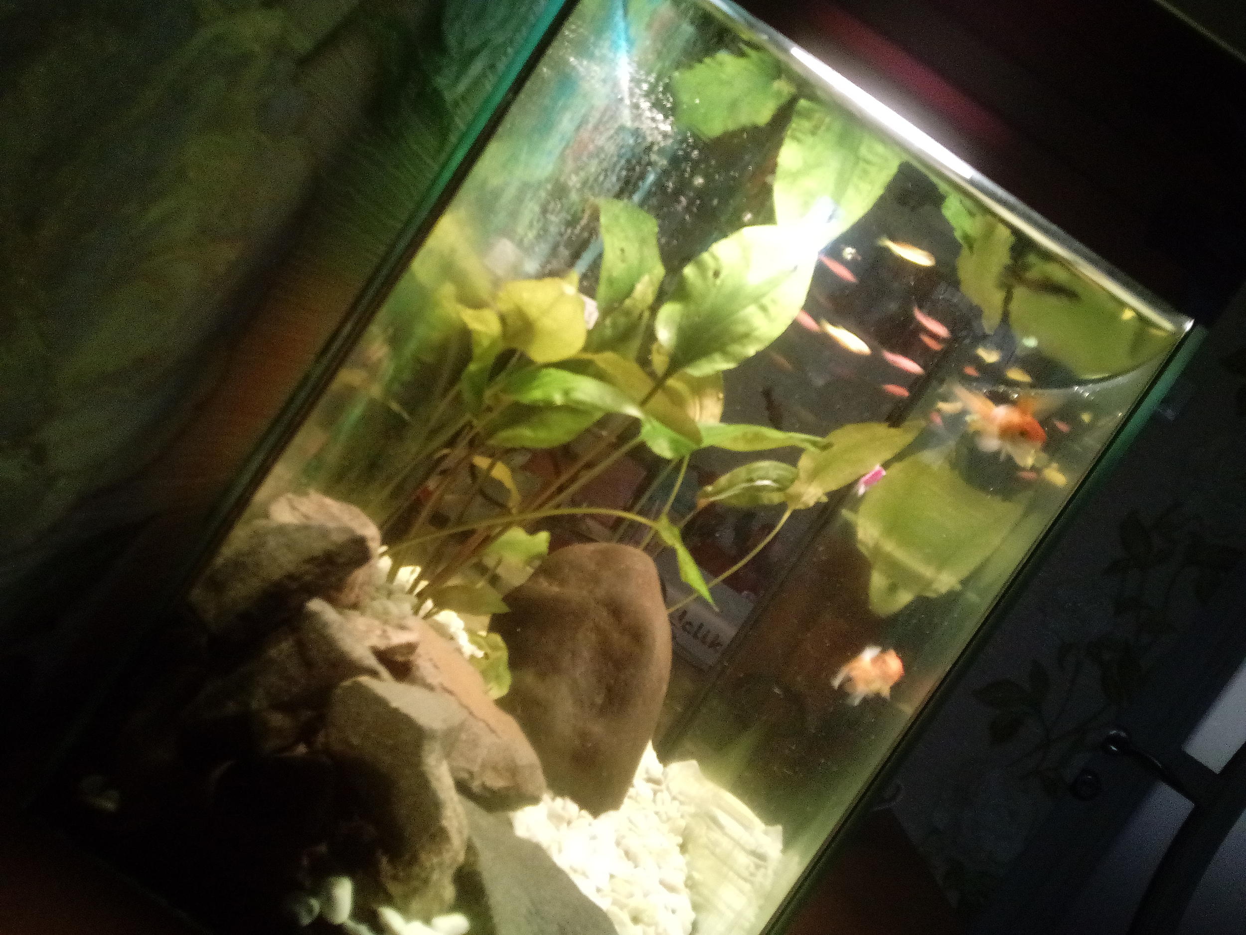 Купил как то двух золотых рыбок,жену порадовать, банку на 10 литров, белые камушки. Спустя несколько дней понял что нужно больше и подвернулся 40 литровый за 100 грн. от коллеги, купил. Докупил ещё мелкий гравий, заказал дешёвый фильтр sun sun за 96 грн. и китайский теплорегулятор. Свет от лампы прищепки 60 ват(8-10 часов в день, лампочка накала обычная). Камни побольше подискал на речке и начал запускать. Отстоял воду, выложил все как надумал, посадил 5 кустиков криптокорины и запустил вуалехвостов и пару гуппи(грунт гравий, а поверх белые камушки) потом докупил 4 тернеции глофиш и вместе с ними принес себе в аквас болезнь манку (зоомагазин не из лучших). Начал лечение: температуру поднял на несколько градусов + кондиционер для воды (малахит). С горем пополам, потеряв двух тернеций, манку побороли. Докупил 8 данио рерио глофиш и две молинезии черные. Вот такой аквас теперь и живёт.