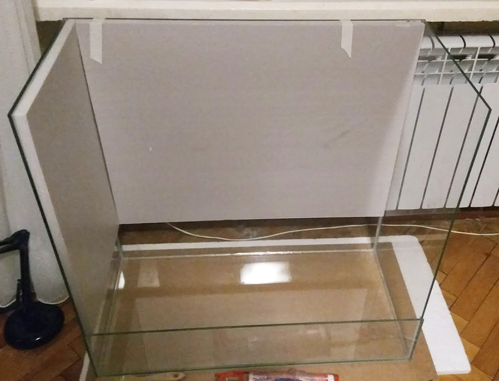 Висота передньої стінки для створення водойми - 18 см. скло основної конструкції - 6мм, дверок 5 мм. Клеїв прозорим силіконом.