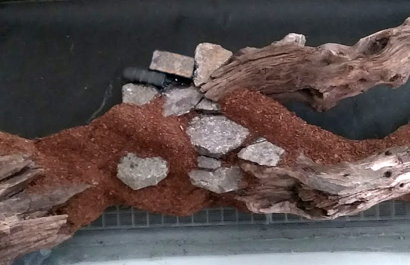 Прошу вибачення у товариства за наступне фото (як виявилось глюкнула карта у телефоні). У фон на силікон вклеїв корягу. Фон вклав у палюдаріум - він у мене опирається на корягу зліва, кусок решітки на заднвй стінці і плюс висить на скобаз з совкових алюмінієвих жалюзі - зробив прорізи у пінополістеролі фону і вклеїв на силікон.