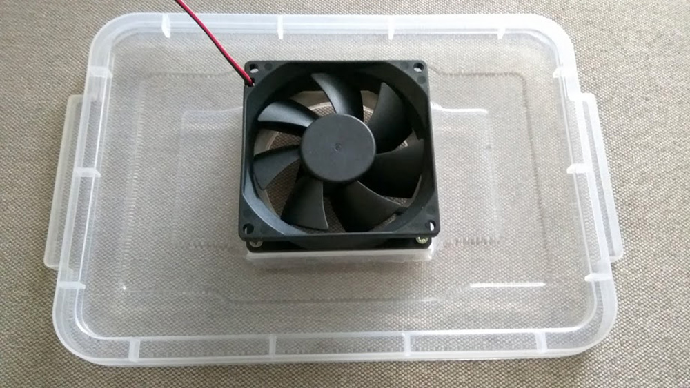 Спочатку зробив сам. Кулер взяв на 24В, на такому живленні нагнітав слабо - напевно вітром частину туману прибиває назад у воду. Підключив до 12В - набагато краще. Туман був середньої щільності. В загальному влаштовувало. Але через пару днів кулер здох. Зрозумів, що на нього потрапляють краплі від туманогенератора. Ставив під кулер ще кусок пластика з меншим отвором, все одно мокрий. Підняв кулер вище - туман став слабшим.
