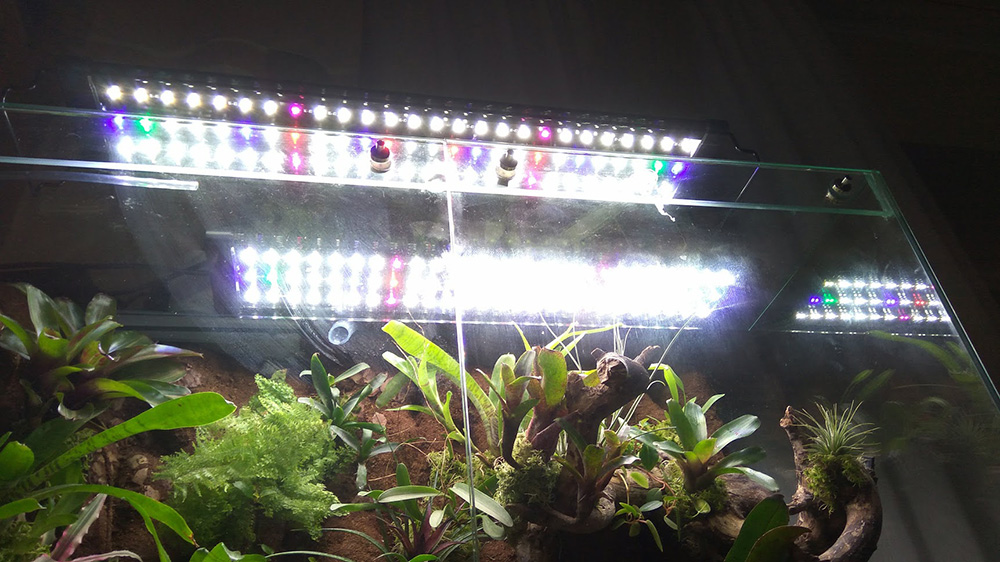 Освітлення змонтовано на основі двох китайських повноспектрових світильників по 18 Вт. Світять не ультра яскраво, але наче рослинам добре. Працюють через розетку-реле з 15.00 до 23.00 Є ще не зібраний світильник з контролером від AQUAPLANNER. Планував його на акву поставити, але думки таки в палюдаріум - схід захід будуть класно підкреслювати куточок природи).