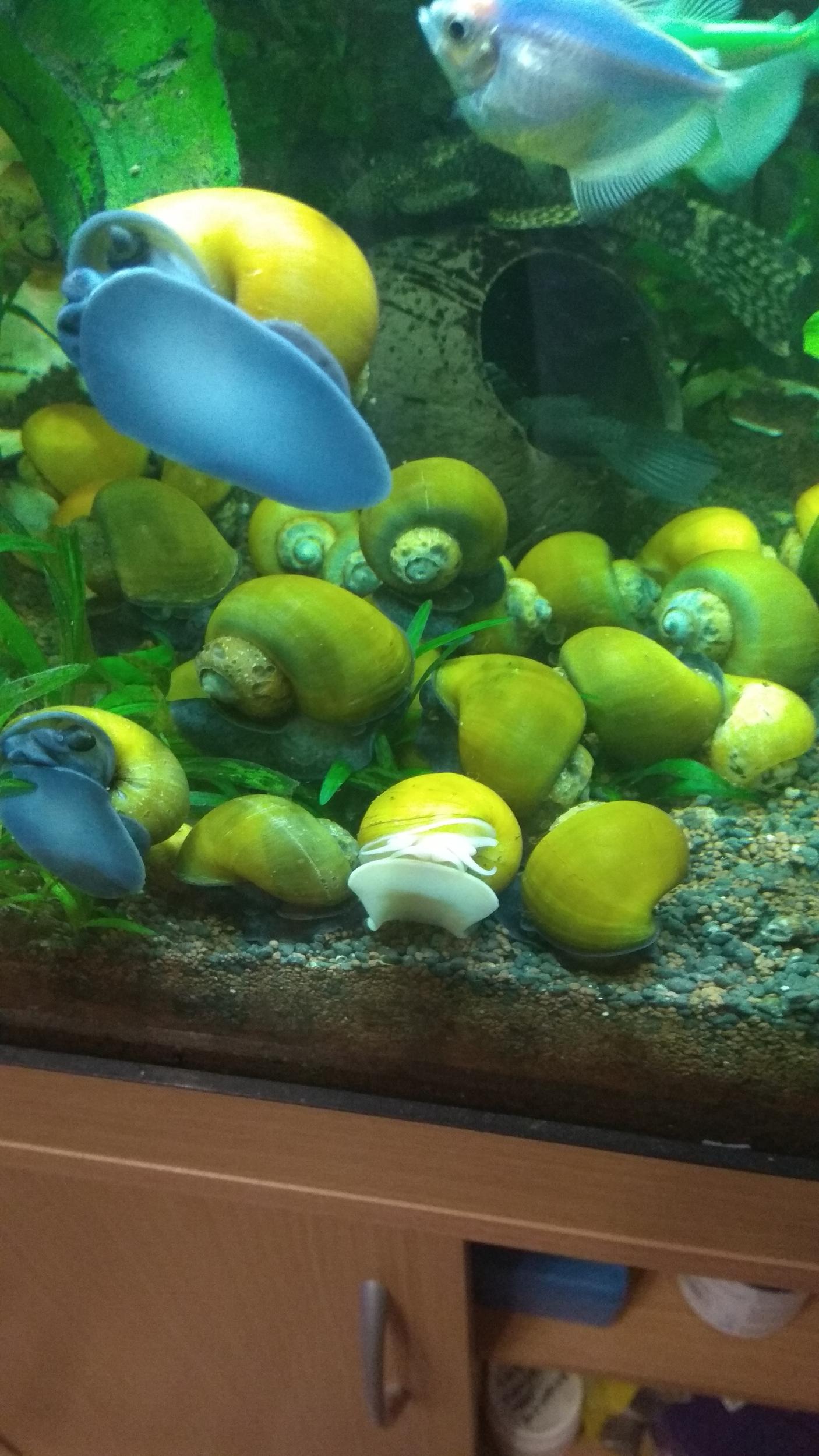 Продам крупных взрослых ампулярий. Диаметр раковины 3,5-4 см. Улитки постоянно нерестятся. Прекрасные чистильщики водорослей!!! Есть разных цветов, желтые класические и темные с оранжевыми пятнышками по телу.