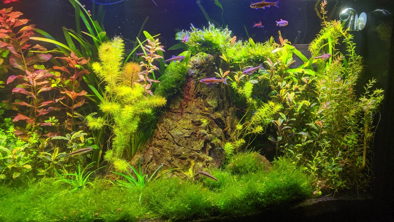 (+)Фото через місяць. Населення: 10 нотропісів (Notropis chrosomus) ; креветки, водорослеїди.