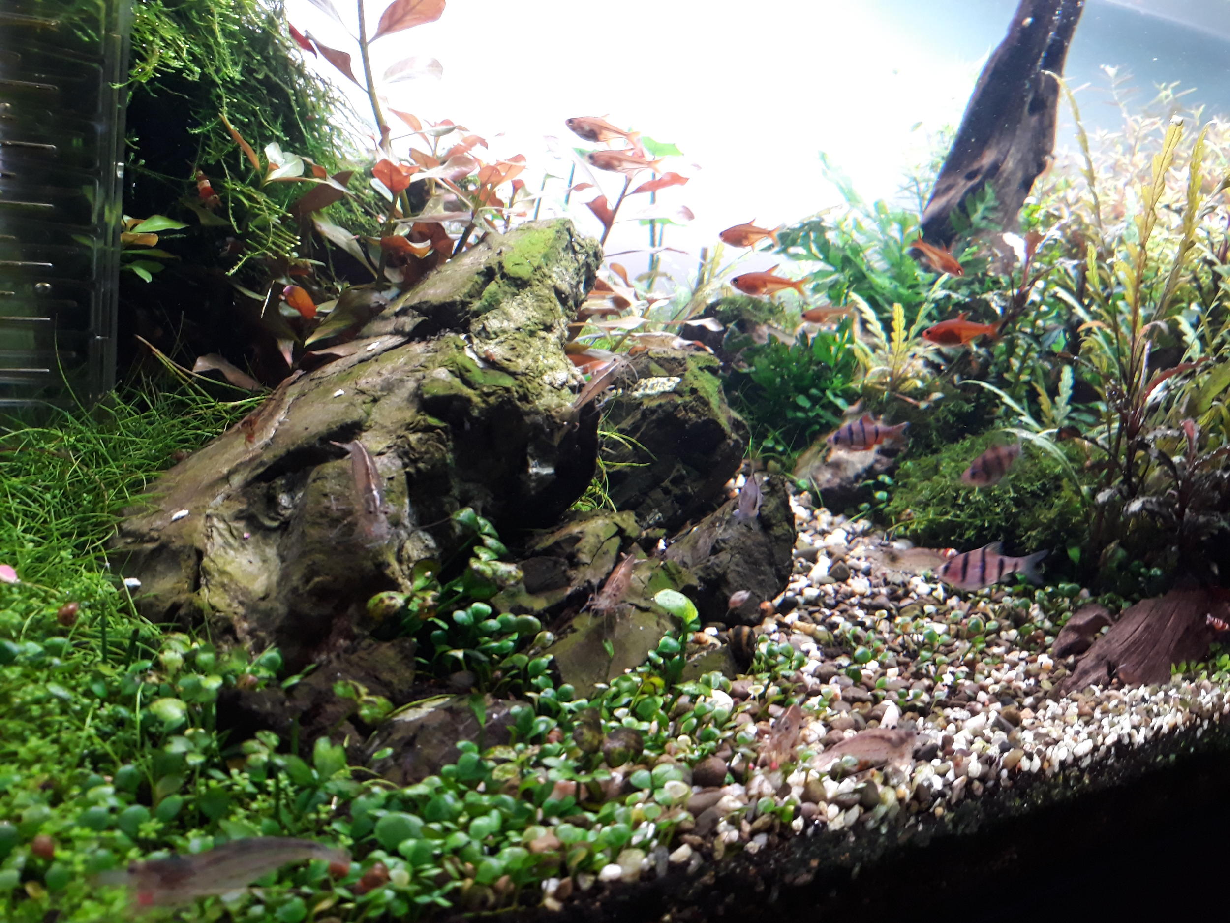 Всем привет! Ну вот, аквариуму уже больше месяца. Что хочу сказать, доволен им. Ждал проблем с водорослями, но их не было! Даже намёка на них! Да, фильтр был в работе на другом аквариуме, вода тоже была взята из действующего аквариума. Сразу заселил Аманок, которые так усердно своими лапками работают.