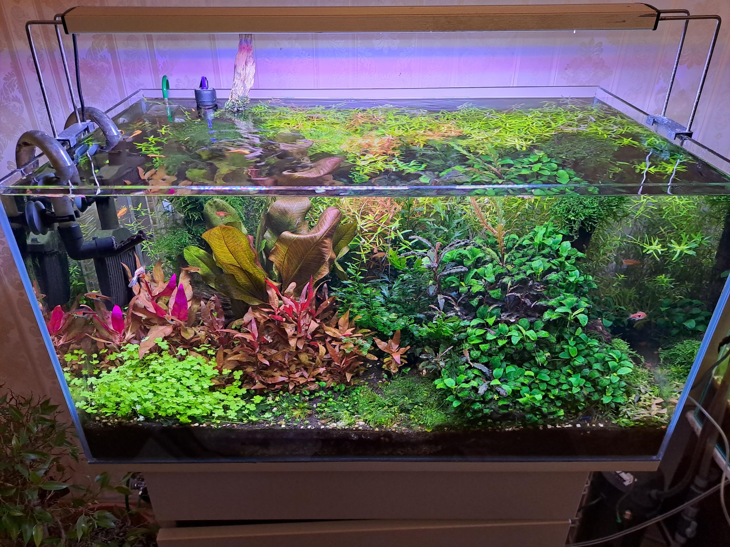 Порекомендовали Тетра Аманду, заселил 15 рыбок, симпатичная рыбка, но пугливая, пока прячется по углам.