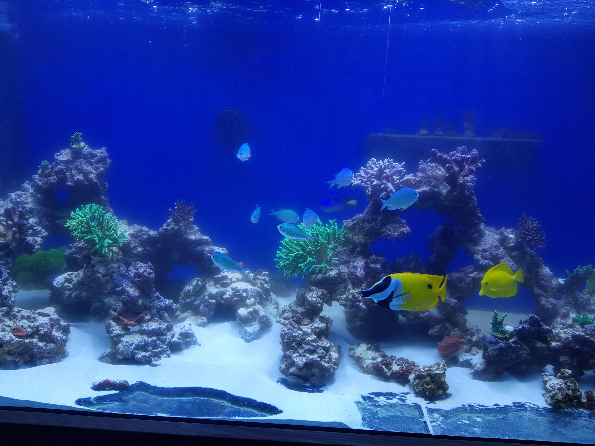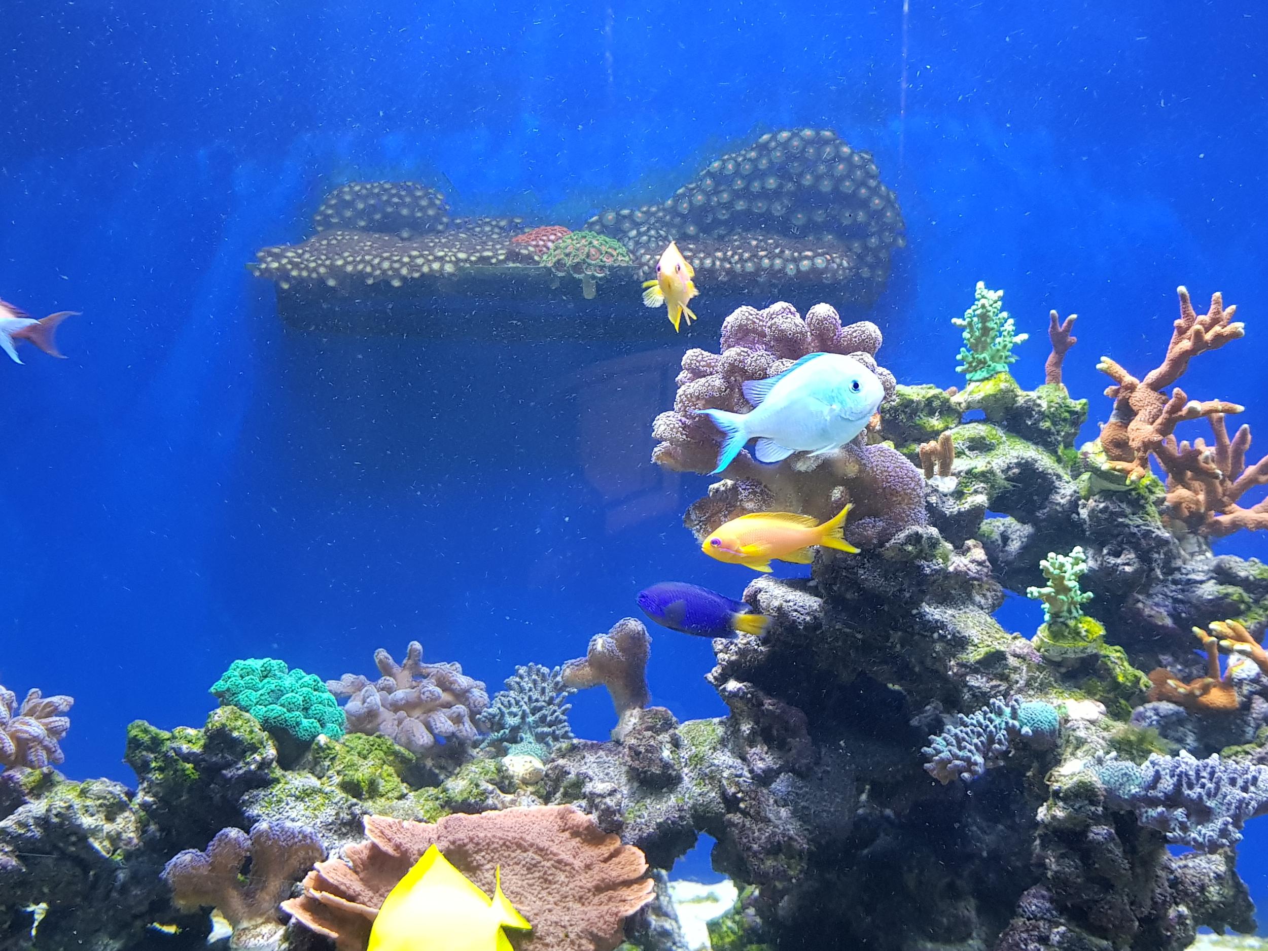 Как видите вода все еще мутная от песка. Покупных кораллов не было все со старой банки. Сериатопора и часть акр потеряли насыщенность цвета, но все что было помещено в банку выжило и начало ударно расти. дальше будут фото все ярче и ярче. ничего в банку не покупал, а фраговал и рассаживал по мере роста