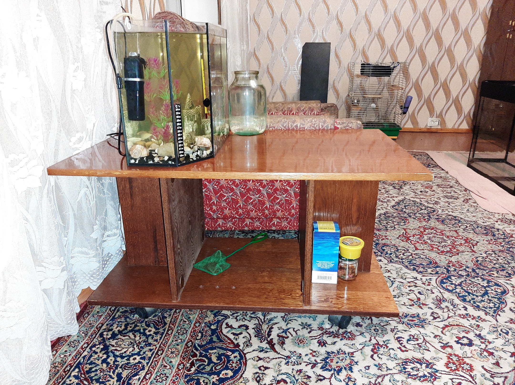 Добрый вечер!Нужен совет.Имею вот такой столик времен ссср.Есть мысль его приспособить под аквариум 165л.Ножки думаю убрать(или заменить на метал).Хочу знать ваше мнение стоит ли заморачиваться.Толщина дсп 1,8 сверху лак.Нешаткий.Длинна четко по размеру аввы.