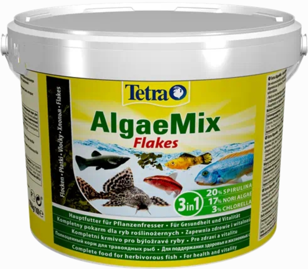 Тетра Algae Mix — это высококачественный корм в виде хлопьев, который специально разработан с учетом особых потребностей всех видов травоядных декоративных рыб. Состоит из сбалансированной смеси спирулины (20%), нори (17%) и хлореллы (3%). Три вида этих водорослей содержат жизненно необходимые элементы и обогащены белком, витаминами и минералами. Кроме того, в них содержится большое количество незаменимых жирных кислот. Таким образом, они способствуют оздоровлению иммунной системы и поддержанию жизненных сил и окраса. Высокое содержание клетчатки обеспечивает здоровое пищеварение. Для обеспечения травоядных рыб максимальным количеством натуральных компонентов корм также содержит ингредиенты животного происхождения. Креветки — это еще одно богатое белком лакомство, которое способствует здоровому росту рыб. Продукт также поддерживает чистоту воды. Тетра Algae Mix — это идеальный полноценный корм для ежедневного питания всех видов травоядных декоративных рыб.