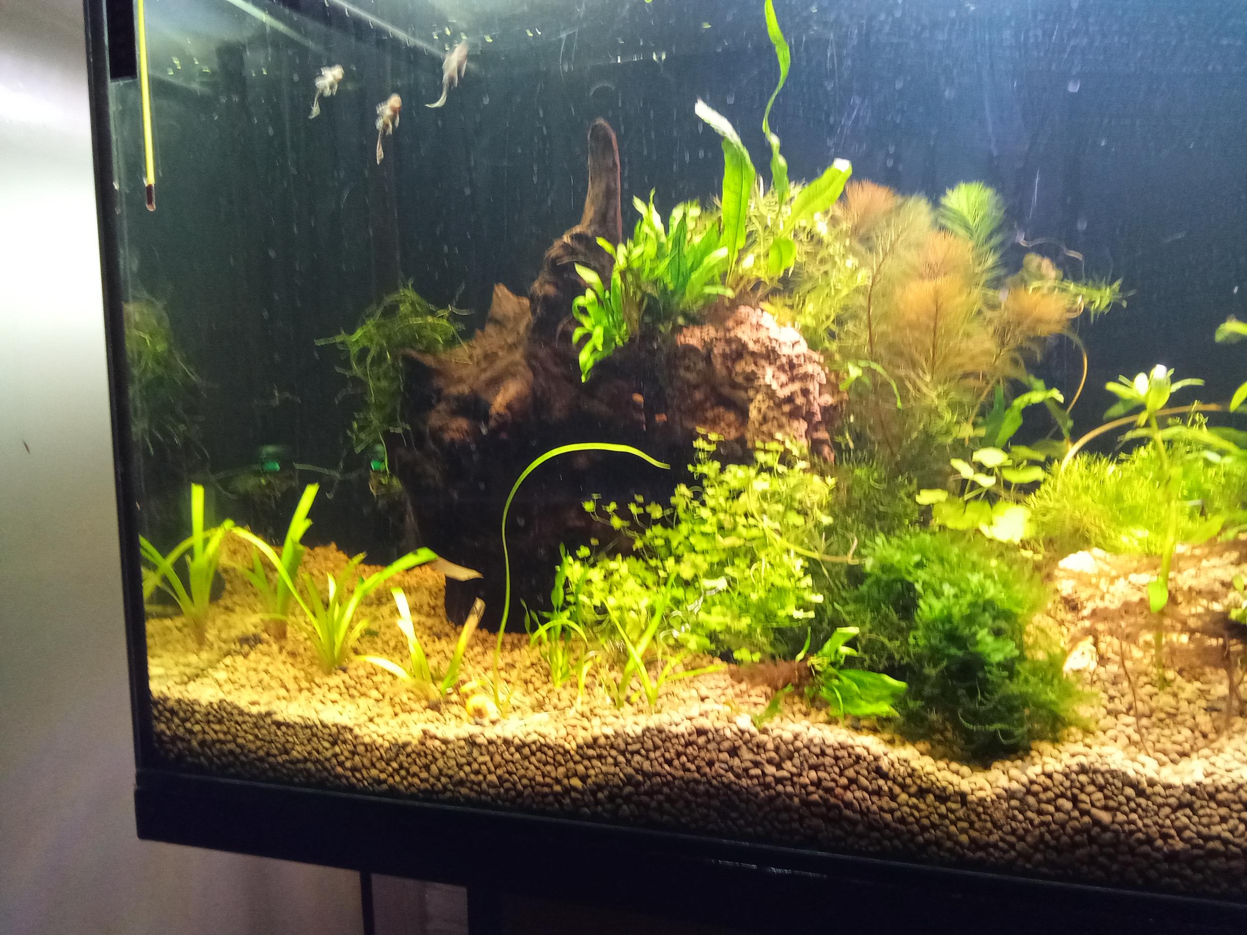 Итак,залит месяц назад,первую травку посадил через две недели,потом через неделю поселил первопроходцев(6 анцитрусов 2,5-3см.и две ампулярии,а также штук 20 неокардин простых.Размер аквариума 120-45-55,свет Светодиодный общ.мощностьи где то 120 Вт.Грунт-керамзит 2-5мм,фильтр внешний джебо839,наполнитель полностью сетка для овощей.Пока свет 5 ч ,сегодня добавил ещё растений завтра выложу фото.Коряги пока не тонут одну приложил камнем,вторую та что справа распер трубкой из пластика.Дале будет...