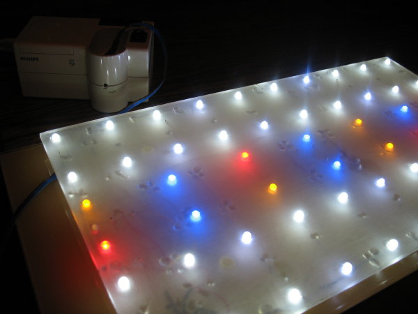 А решил сделать при выключении основного света включается синий свет(лунный свет)-есть светодиоды с рассеюваемым светом,плюс со светодиодами направленного света,потом светодиоды расееные отключаются и остаюрся светодиоды направленного свечения.