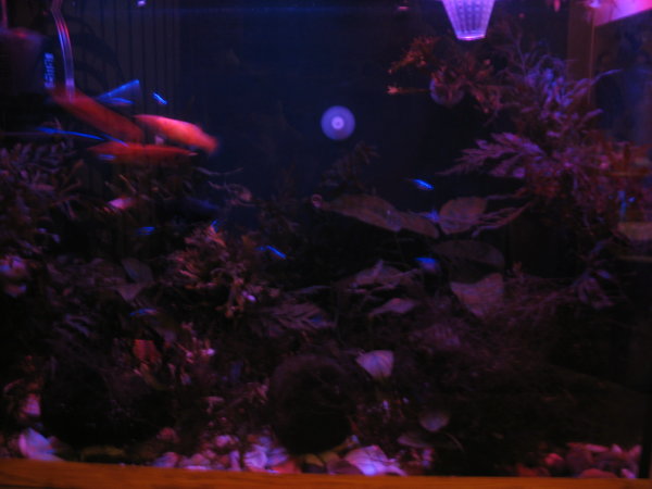 и в третьих слабую еле видную ночную подсветку(ночью у меня иногда рыбы так плещуться,а этого не видно без света!
