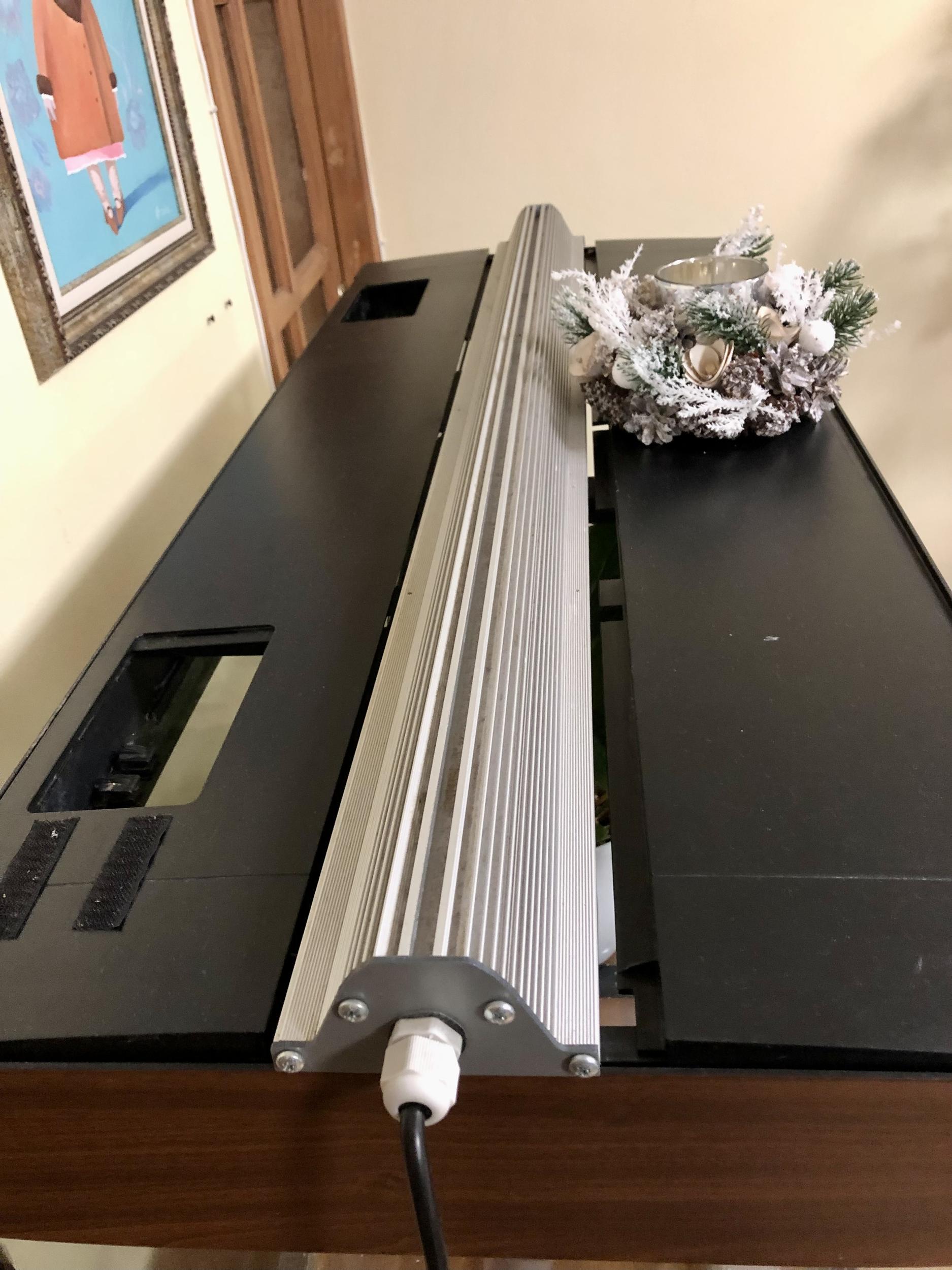 Аквариум, тумба, две крышки (оригинальная пластиковая и заказная под размеры), два светильника (комплектный под люминесцентные лампы и светодиодный светильник достаточен для травника), контроллер Aquamini + два преобразователя Meanwell и два блока питания.