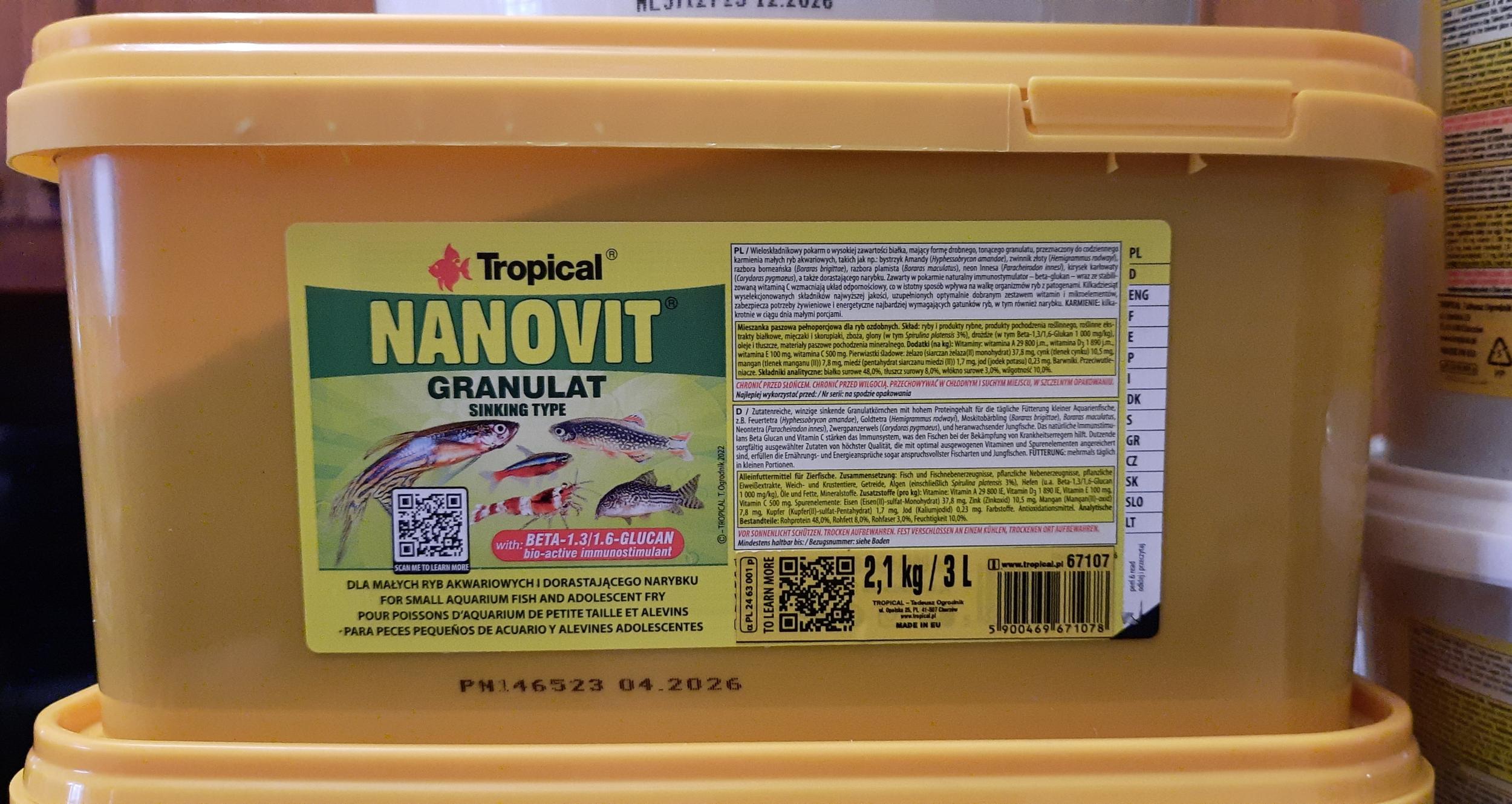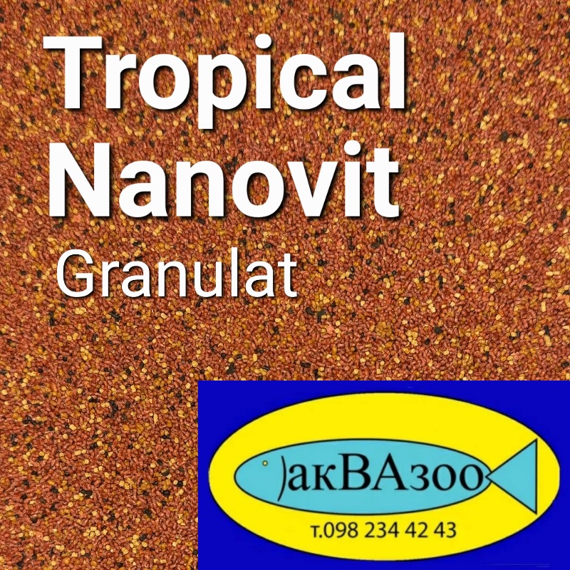 TROPICAL NANOVIT GRANULAT oсновной корм для небольших аквариумных рыбок и подрастающих мальков*Многокомпонентный корм в виде мелкого тонущего гранулята для аквариумных рыб недольших размеров, таких как, например: тетра аманда (Hyphessobrycon amandae), тетра золотая (Hemigrammus rodwayi), разбора бригитта (Boraras brigittae), разбора пятнистая (Boraras maculatus), неон алмазный (Paracheirodon innesi), сомик пигмей (Corydoras pygmaeus), а также подрастающих мальков. Стойкость рыб к заболеваниям укрепляет натуральный иммуностимулятор – бета-глюкан и стабилизированный витамин С. Несколько десятков отборных компонентов самого высокого качества, дополненных оптимально подобранным набором витаминов и микроэлементов обеспечивает пищевые и энергетические потребности наиболее требовательных видов рыб, в том числе также мальков.