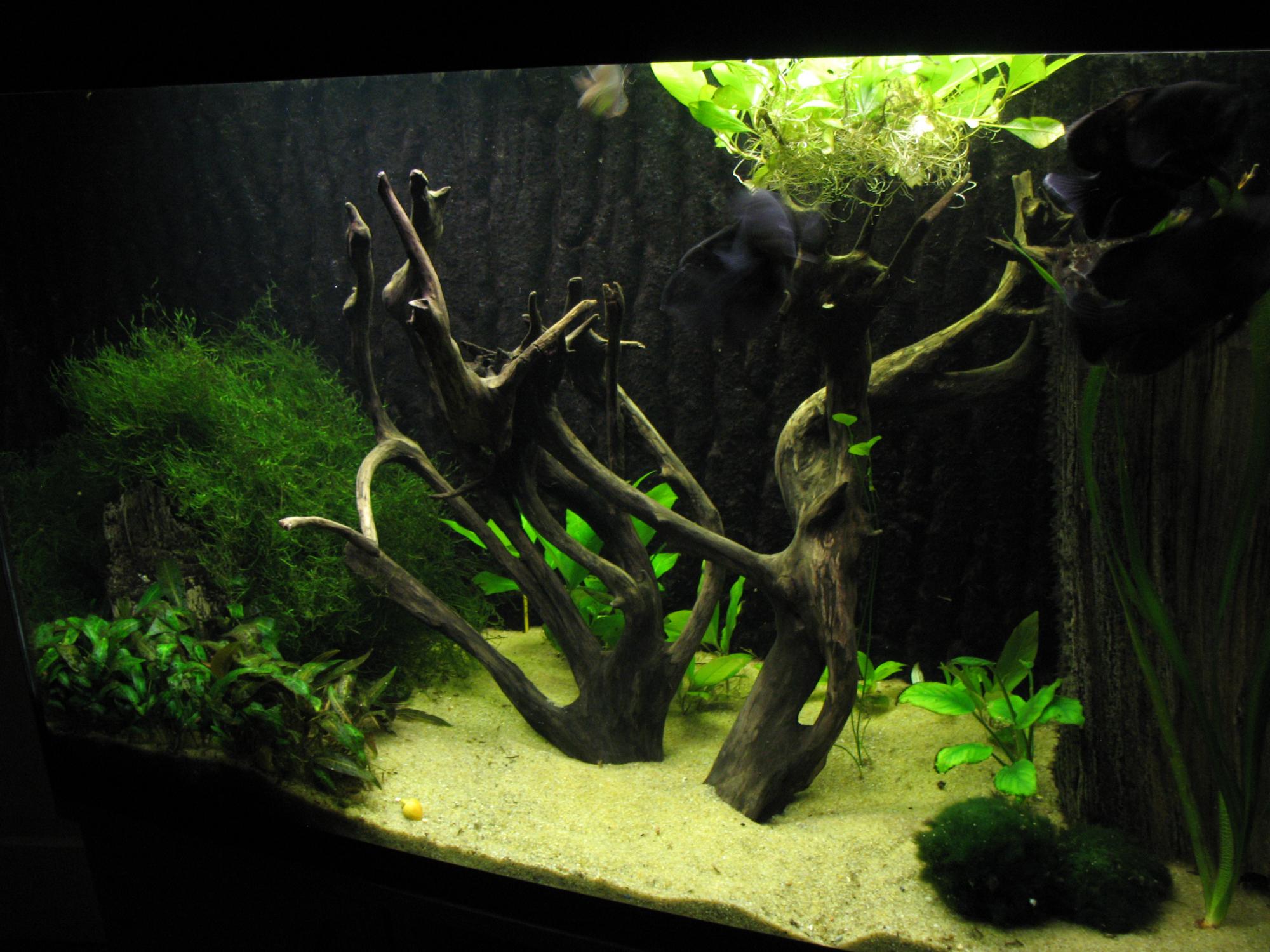 пісок дійсно дрібної фракції, тому і з рослинами прийшлось забути, до астронотусів там золотуха жила щей вона тим рослинам життя не давала та і взагалі акваріум 123/40 висота65 см і всього навсього 2 лампи по 30 ВАТ. а брав пісок бо фон в мене темний... Для декору використав закамяніле дерево з обох боків, а рапанів дійсно заберу