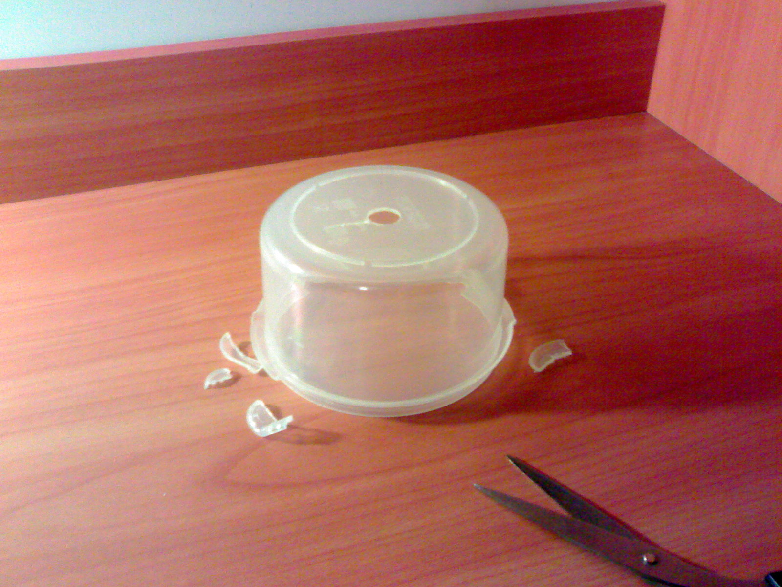 После покупки ваза заняла почетное место наверху книжного шкафа, в виду того, что надо было продумать устройство крышки с освещением, другого оборудования. Обдумывание заняло порядка недели, в результате были сделаны выводы: крышка должна быть легкой для устойчивости, крепиться жестко, иметь отражатель в виду высоты столба воды. Выбор материала был сделан в пользу пластмассы. Вооружившись рулеткой, которой были предварительно замерены диаметры вазы, начались походы по магазинам, супермаркетам в отделы освещения, посуды. В результате был приобретен пластиковый контейнер для продуктов, пластиковая лейка. По размеру контейнер должен был входить в вазу, лейка соответственно в контейнер. Радости и удивлению не было предела, когда контейнер стал в вазу тютелька в тютельку – видимо их делают либо на одном заводе, либо специально под размер друг друга.