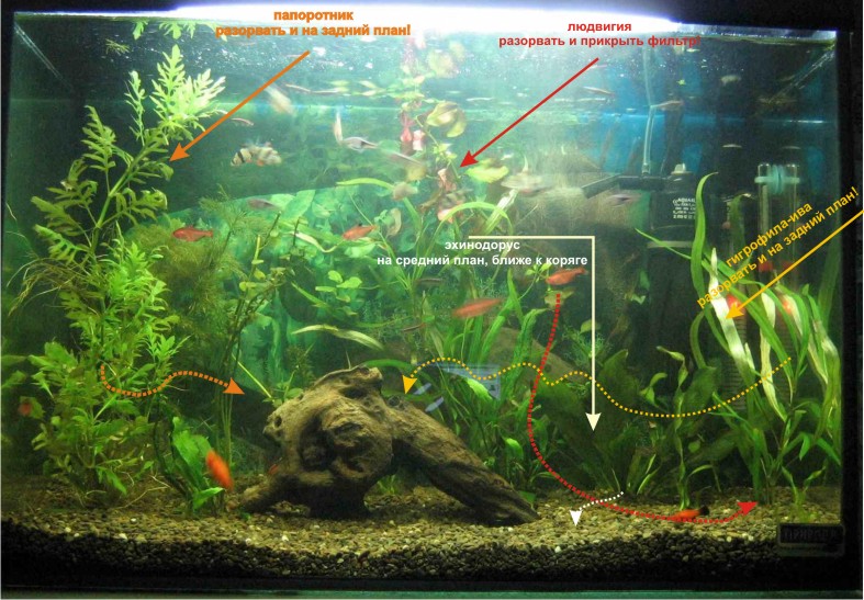 За корягой, ближе к фильтру растет людвигия (с красноватыми листьями)-разорвите её пополам и посадите оторванную половинку рядом, а через месяц, когда обе половинки отрастут до верха аквариума-снова их переполовиньте и у вас получится небольшая кудрявая рощица, которой можно замаскировать фильтр!