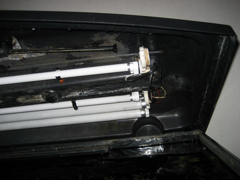 В крышке, которой комплектуется аквариум производитель устанавливает только 2 лампы по 40 Ватт (то есть 0,17 Ватт/литр - из живых растений совсем немного что может вырасти). Так как отражатели не дали бы требуемого эффекта, не увеличили бы интенсивность до 0,5 Ватт/литр. Поэтому это было неизбежно, вот что получилось.