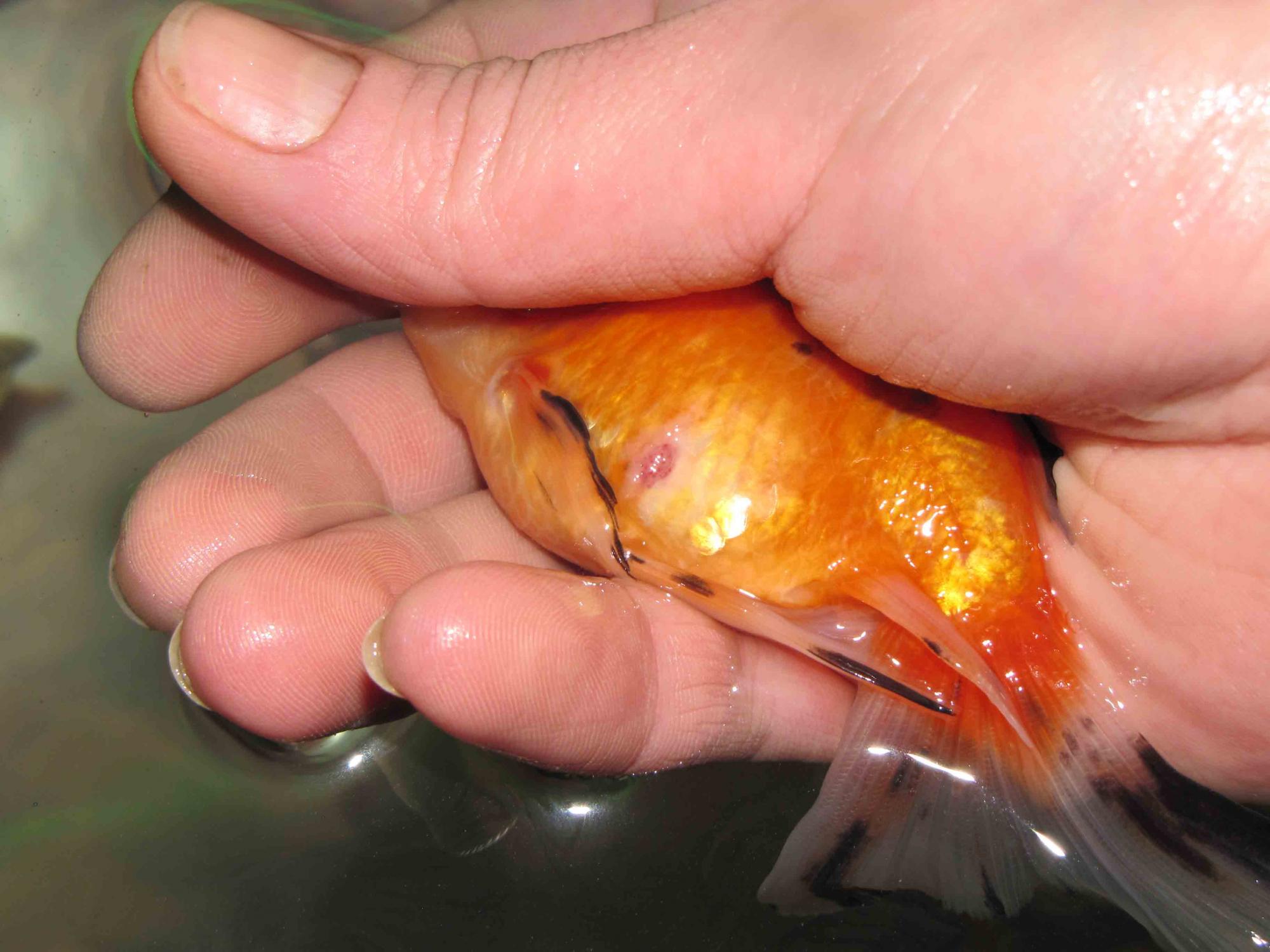 Звязалася зі мною одна пані, в неї проблема. Купила приблизно 20 грудня золоту рибку, і посадила в акву до інших. Десь 30-31 почалося зараження інших рибок. Живою нова рибка була 5-7 днів. Потім здохла тихо опустившись на дно без жодних признаків життя. В інших рибок на 7-8 січня була помічена луска прозорою з дірочкою всередині. Станом на тепер під лускою виділяється слиз із червоним кольором (напевно що кров) виглядає наче видно кусок підшкірної тканини (мяса). Були ще червоні цятки під глоткою, котрі видалялися механічним способом і потім кровоточили. Н аплавниках теж видно розїдання тканини і білі плямки. Рибки активно рухаються і годуються до поки непідуть гайту. Від заражених риб є потомство 2-3 дні приблизно. Порадьте чим лікувати.