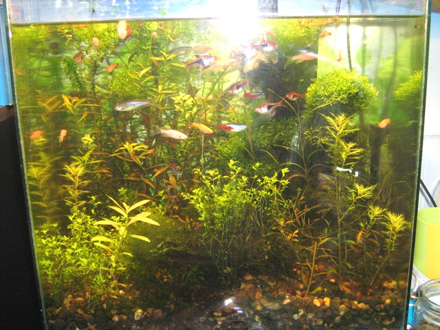 Вчера решил навести порядок в банке 230 л. Были удалены растения, рыба не удалялась из аквариума, далее промыл грунт и засыпал поверх  богатого детритом первоначального грунта, базальт фракции 3-5 мм. Наутро вода была, как слеза  Обошлось без жертв. Сегодня, засадил баночку отбросами производства  По правую руку, где нагреватель, высажена молодь спиральной валлиснерии, которая прикроет нагреватель, довольно быстро, а её тень не будет наводить дискомфорт соседнему криптокориннику, по центру анубиасы, за ними красная нимфея и рдест гайя, которая прикроет флейту фильтра. По левую руку небольшой садик эхинодорусов, закрывающих фильтр. Из-за избытка света фото получились не ахти, но по ходу пьесы буду выкладывать.
