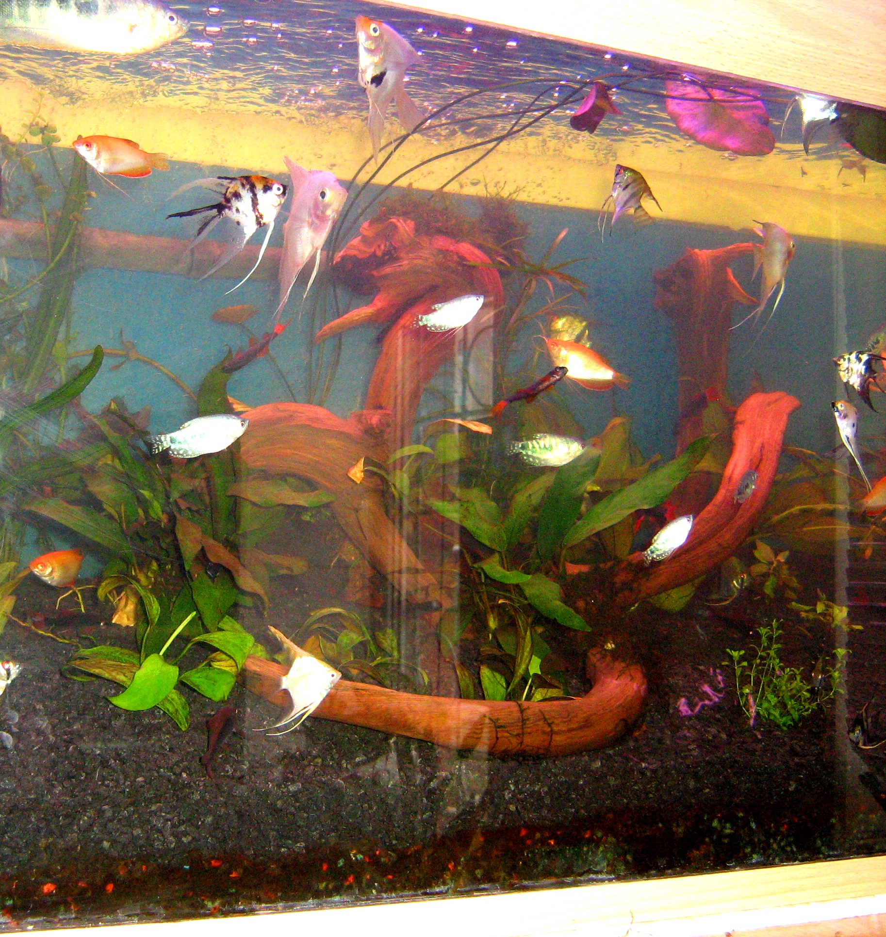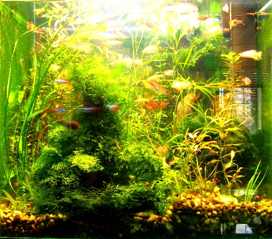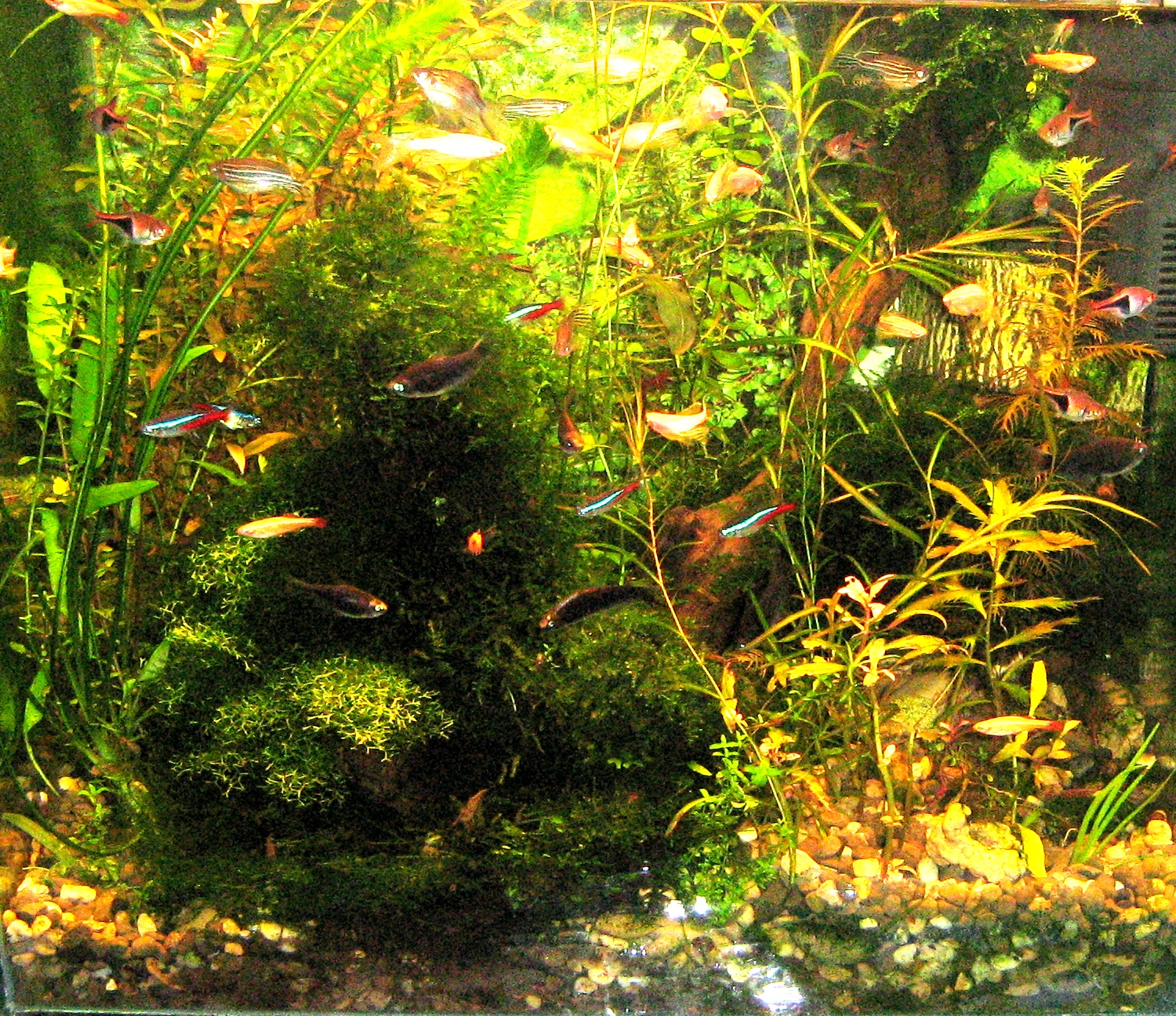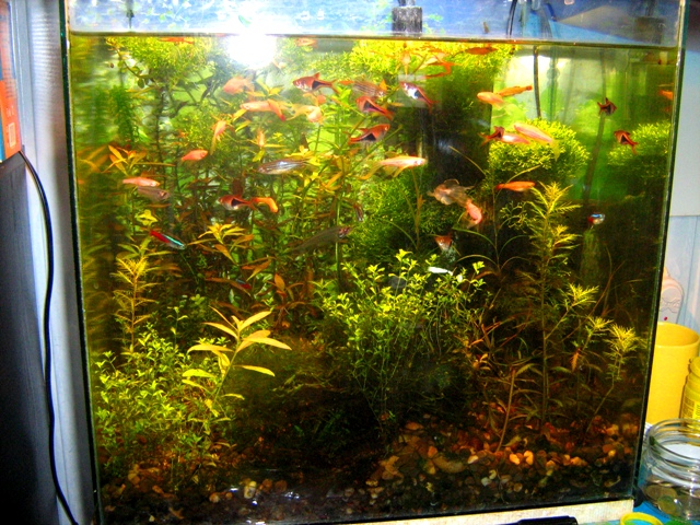Вчера решил навести порядок в банке 230 л. Были удалены растения, рыба не удалялась из аквариума, далее промыл грунт и засыпал поверх  богатого детритом первоначального грунта, базальт фракции 3-5 мм. Наутро вода была, как слеза  Обошлось без жертв. Сегодня, засадил баночку отбросами производства  По правую руку, где нагреватель, высажена молодь спиральной валлиснерии, которая прикроет нагреватель, довольно быстро, а её тень не будет наводить дискомфорт соседнему криптокориннику, по центру анубиасы, за ними красная нимфея и рдест гайя, которая прикроет флейту фильтра. По левую руку небольшой садик эхинодорусов, закрывающих фильтр. Из-за избытка света фото получились не ахти, но по ходу пьесы буду выкладывать.