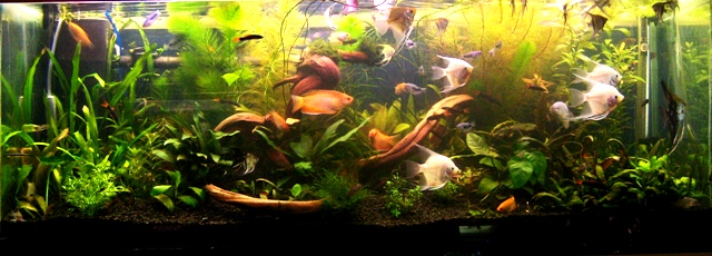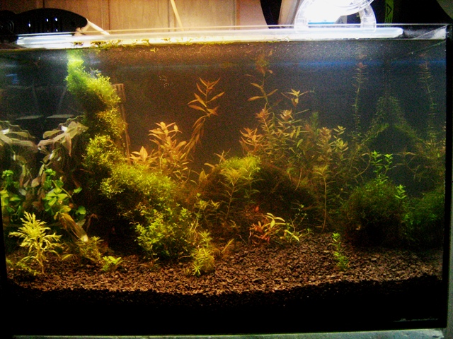 95 литров, запущен с нуля две недели назад, легкомысленно засыпал под грунт 1 кг верхового торфа, за что был вознагражден мощной бактериальной вспышкой и каким-то грибком на листьях растений (видимо результат скачка фосфатов, никаких замеров не делал, всё на глаз), которыё в свою очередь были взяты из банки, поросшей нитчаткой и кладофорой   , далее, проведя мощную химическую атаку  , были уничтожены водоросли, и сильно досталось растениям, думал, что им хана. Но, природа  берёт своё, и возвращает на круги своя, сегодня этих проблемах напоминает кое-где неприглядный осадок на листьях, который в виду отсутствия течения в банке ждёт, пока его струхнут  В банку, был установлен стерилизатор, без которого думаю, всё так радужно не обошлось бы  Вот баночка на сегодня: