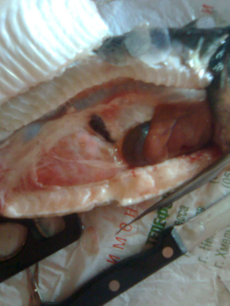 уменьшение селезенки с очагами некроза (некроз не показатель рыба давно сдохла )