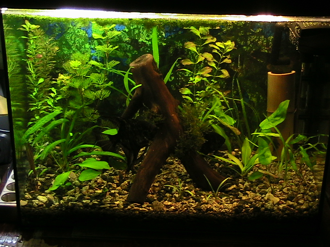 Первые 3 фото-день запуска,2-последние вчера.Как видите одну бамбуковую трубку убрал,вторая заростет, видно не будет.Фон действительно буду менять.Ну а коряга дорога как память(еще с цихлид, 4 года).Стояла в разных углах аквариума.Середина самый оптимальный вариант(ширина аквариума 25 см).Помпу убрать за корягу пока не могу.Помпа опять же от цихлид 600л\ч, для растений на такой объем мощновата. Поменяю на меньшую тогда попробую.Скаляриям 4 года.