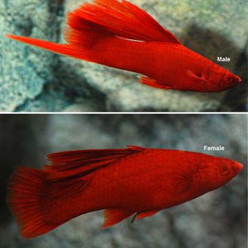У меня есть обычная ада(крупная сама по себе) и флаговая (присутствует карликовость, не крупная). А насчёт красного цвета как на вашем фото, то я думаю, что рыбу подкармливали красящими кормами. Я этой технологии на своих рыбах не применяю. У меня чёрные меченосцы с оранжевыми плавниками, с красными я не встречал, разве что, опять таки, чем нибудь подкормить.