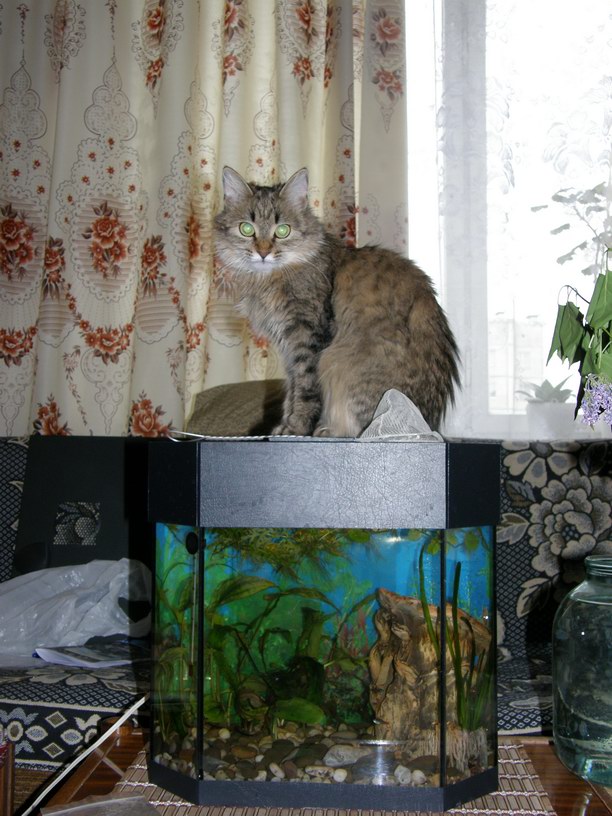 Установил аквариум на тумбу. Кошка Маська тут же облюбовала его.