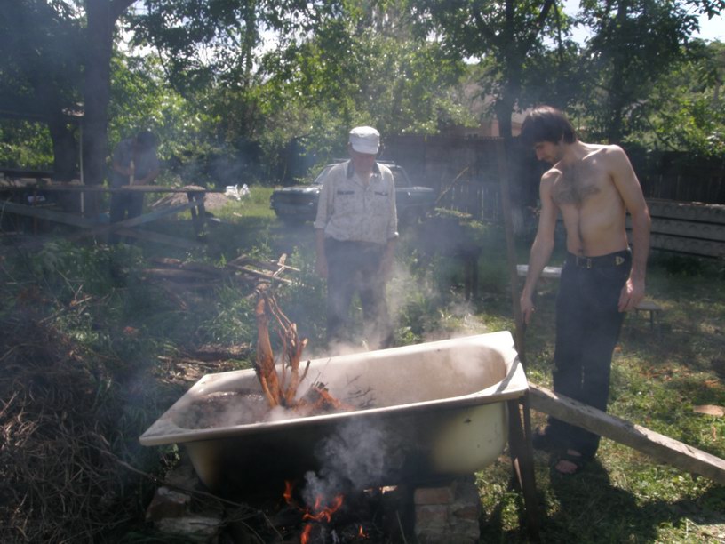 Выкопал, ободрал кору (занятие для мазохистов; после варки размокшая кора обдирается на ура, но кора сильно красит воду и дерево). Нашел старую ванную, поставил ее на костер. Понаблюдал за лицом продавщицы, у которой я купил 12кг соли. Спалил весь мусор на даче, вываривая ее день в соленом растворе, время от времени переворачивая, т.к. вся она не погружалась в воду даже в ванной. Потом еще один день в чистой воде без соли. (Интересны мысли соседей наблюдавших как молодой человек на костре в ванной варит бородатый пень, переворачивая, перемешивая и доливая воду, вот уже целый день). Потом еще дней 7-10 она лежала и кисла в воде с подменами раз в 2-3 дня.