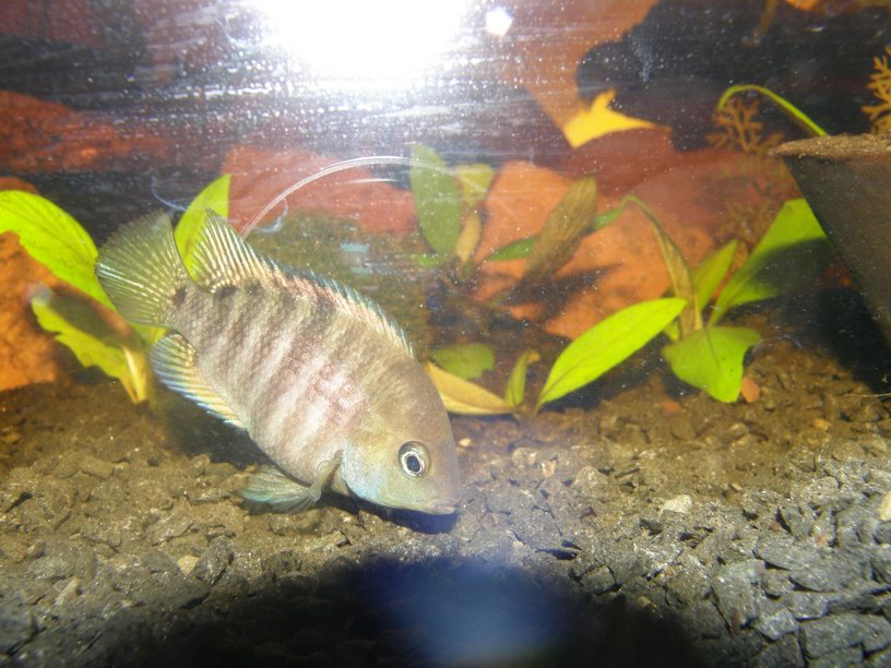 Отловил остатки рыбы из маленькой аквы (два дня ушло, т.к. никак не мог поймать одного анцитруса и двух неизвестных мне полосатых хитрожопов, которые спрятались и устроили мне инсцинировку "Защита замка"; может, кто подскажет их название?) и пересадил всех в большую. Забрал у друга брата еще несколько взрослых рыб. Все плавают и радуются жизни. Вода прозрачная, неприятного запаха нет.