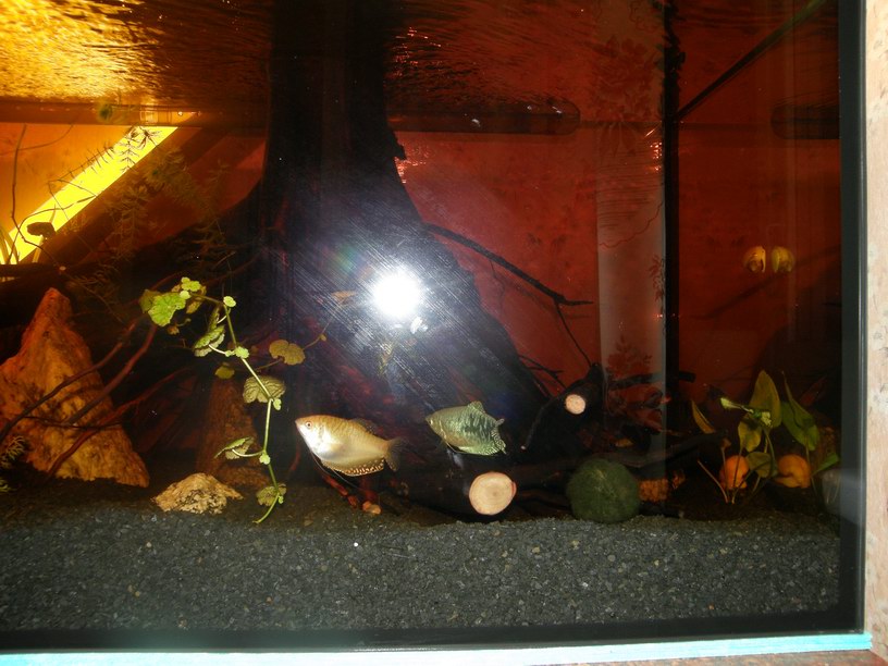 Два месяца назад были в гостях у бабушки моей девушки. И я вспомнил, что аквариум, умершей уже как пол года, красноухой черепашки Матильды (точно такой же как черепах =) Леон, который был подарен ошарашенному другу – видели бы вы его лицо: «Хм-м!… Не-е… ну, конечно, спасибо за подарок!…»; попробуйте как-то подарить другу на ДР черепашку в аквариуме) лежит и пылится на балконе. Крыза, работы мало, решил отвлечься - завести рыбок. Забрал акву на 20-25л, купил грунт, растючку и рыбок (неоны, барбусы суматранские, золотая, гуппи). Отстоял воду, залил, пустил. На радоваться не мог на золотую рыбку. Такая красавица! Через две недели она умерла и еще пару других...