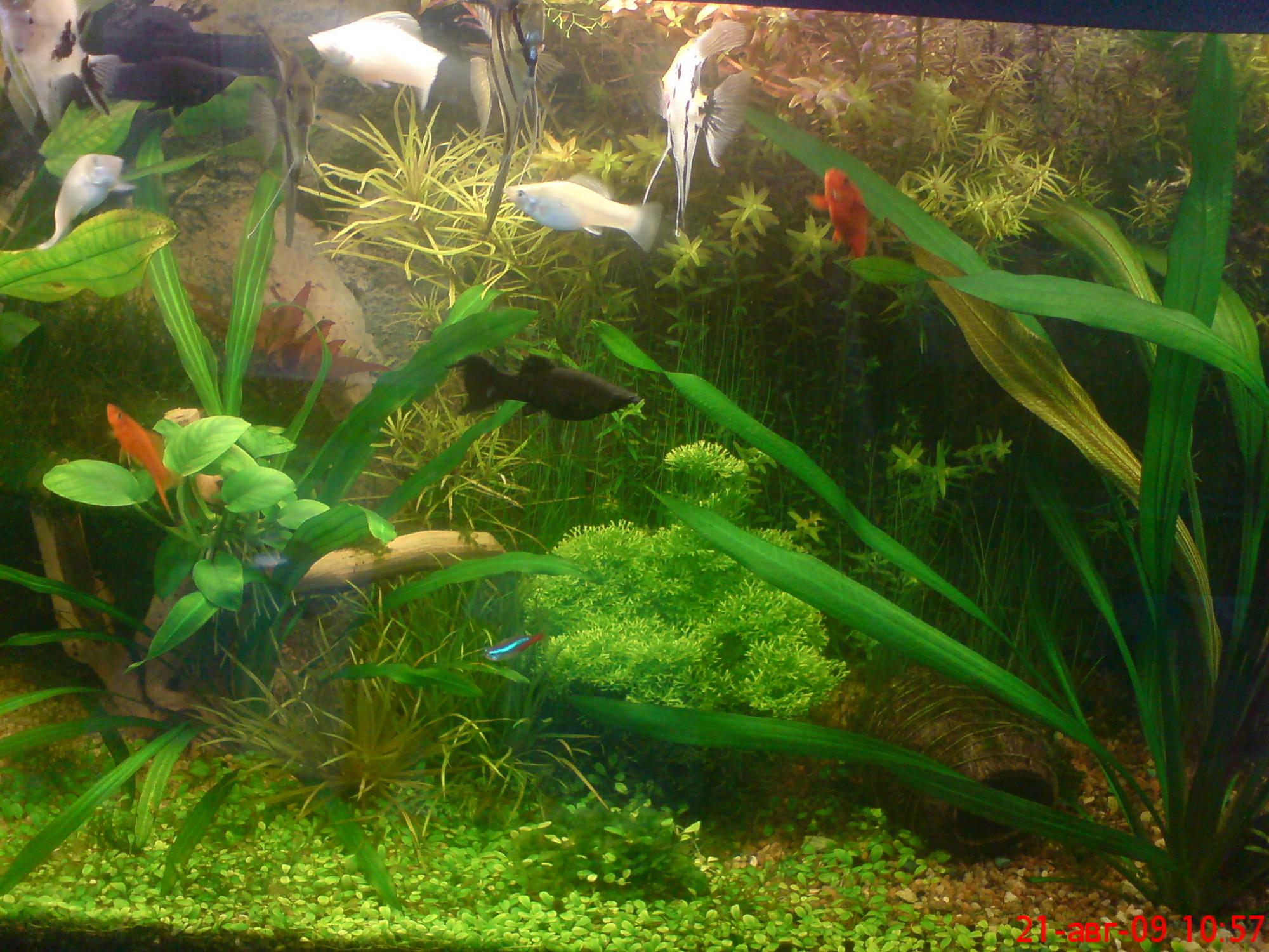 Аквариум, спустя 4 месяца. За этот период времени растения немножко подросли. Жду Ваших коментариев по улутшению. За фото извените, фоткал телефоном, лутше не получается!