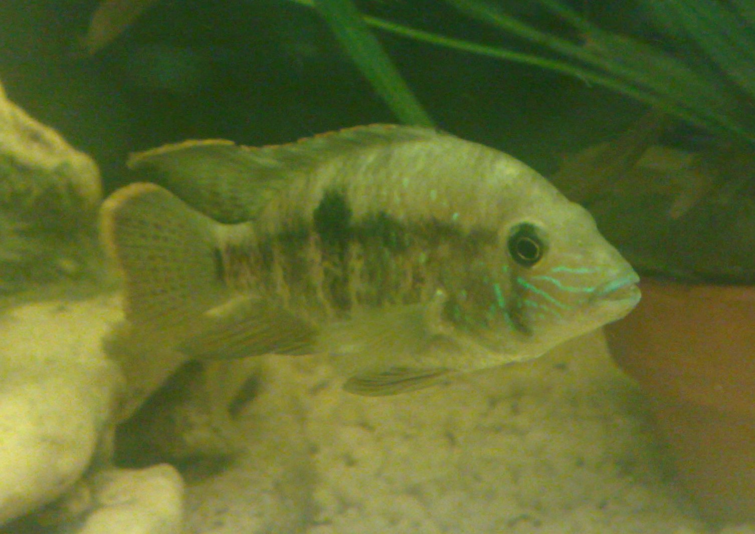 З горнами по сусідству і зелений терор (американська назва бірюзової акари) може бути недомінантним, відтак не берусь встановлювати стать за цими фото, тим більше риба ще досить молода.