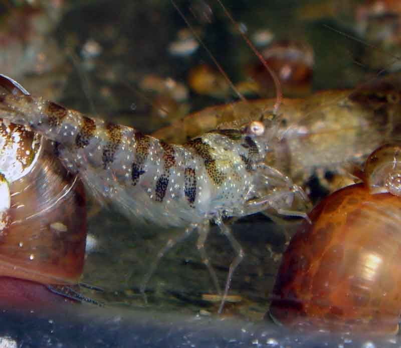 У мене ситуація подібна. Тільки сфоткати дуже тяжко. На базальті цих креветок практично не видно. Малих випадково (порядку 6-8 мм) помітив лише кілька днів тому.