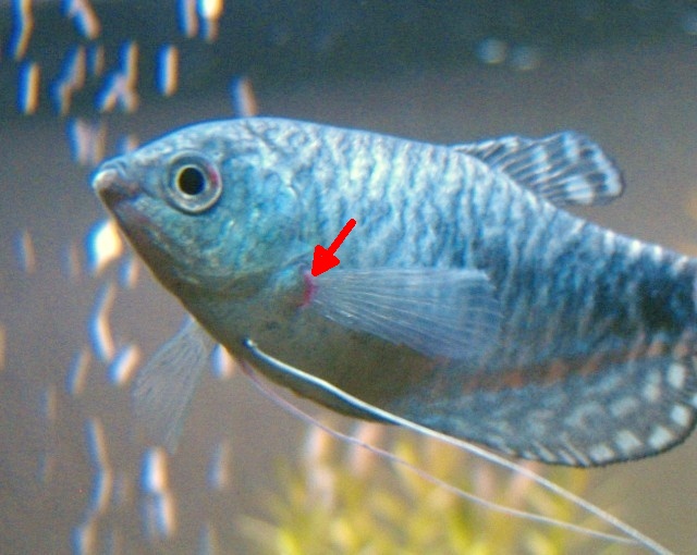 Пару недель назад у самки мраморного гурами появилась красная ранка у основания брюшного плавника. Иногда ее гоняет самец, поэтому подумал может просто ушиблась где-то. Позавчера такая же ранка появилась и у самца. Поведение рыб не изменилось, на аппетит не жалуются. Температура воды, освещение, корм не изменялись.