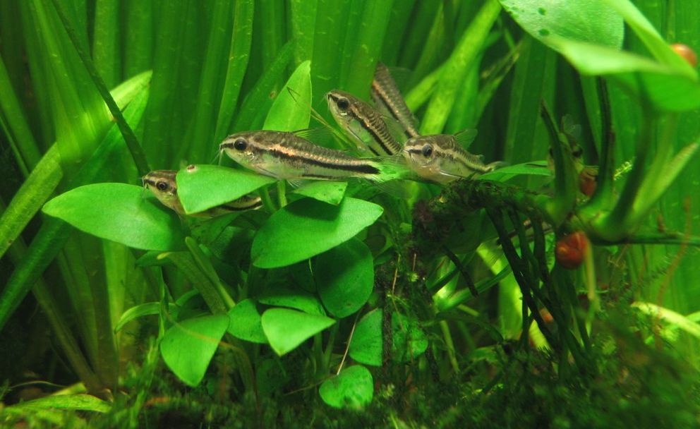 у меня стайка пигмеев из 11 шт. в 180 л ведет себя очень бодро, никого не бояться , суетятся, плавают стайкой. Только я не вижу чтоб они хватали корм  только по листьям шуршат.