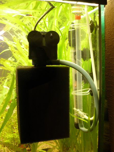 Долго экспериментировал с конструкциями реакторов...и вот пока остановился на такой модели....из внутреннего фильтра поток по трубке направляется на дождевалку (трубку с отверстиями вдоль оси)...которая установлена в корпусе диаметром 40 мм (упаковка из под шариков для настольного тениса). Дождевалка размещаеться наким образом, чтобы струи воды выходили из отверстий по касательной к внутренней стенки большей трубы. Подача СО2 производиться от балонной системы.