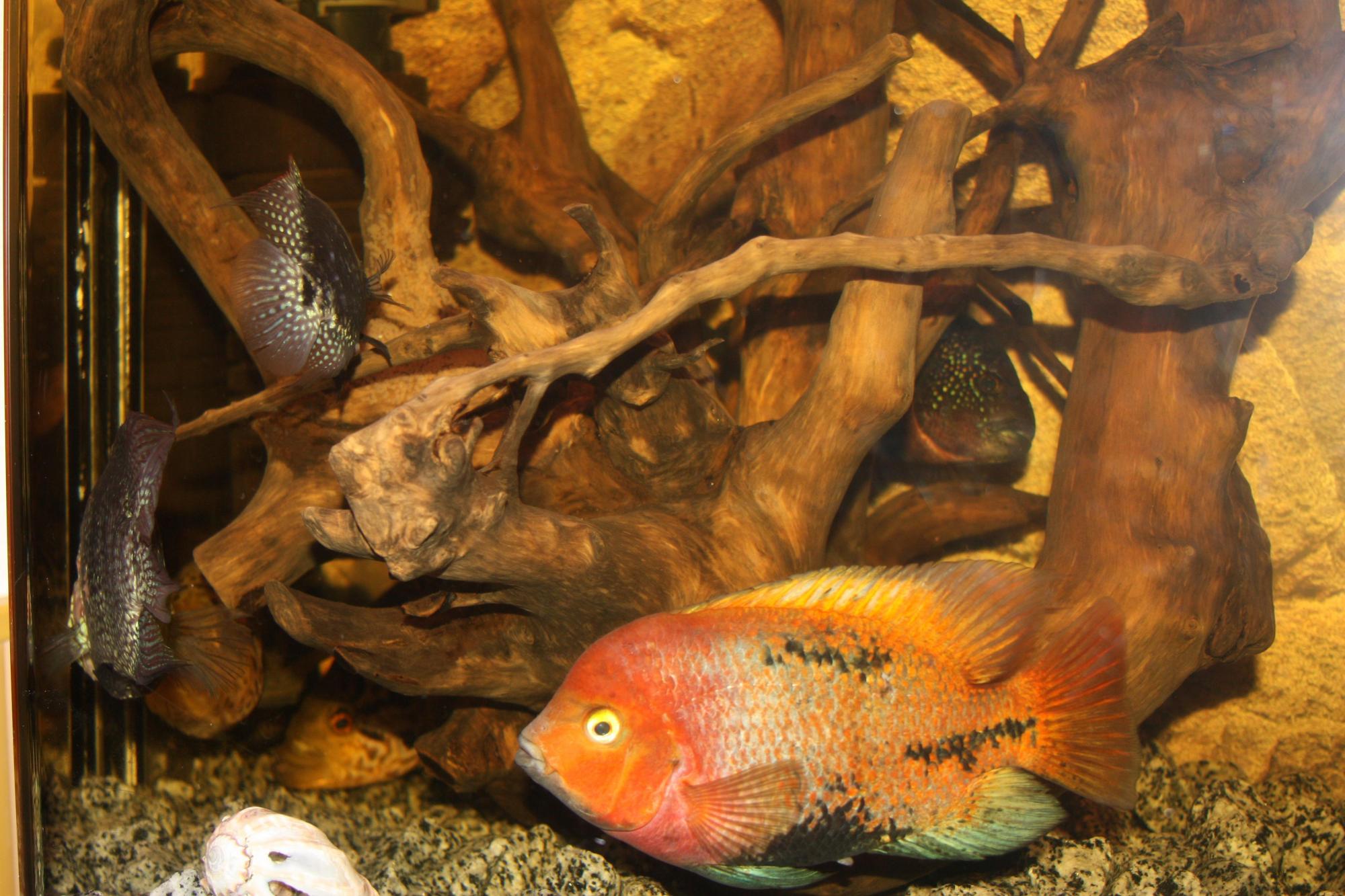 Прямо под веткой на которой икра ,территория манагуанцев,рядом радужные,за корягой восьмиполосые.Для чего это пишу,хочу показать новичкам,что аквариум с крупными американцами,это не поле битвы с множественными жертвами.В аквариуме полное спокойствие,и малька водить будут,и то же никакой войны не будет.Бывало,что нерестились по три пары одновременно и никто не пострадал.Для чего это все навоял: хочу объяснить новичкам которых пугают,что американцы, это ужас в аквариуме,это не ужас ,это класс. Если аквариум плотно заселен,будет полное спокойствие и можно спокойно подсаживать новую рыбу.Если в банке плавает 1-2 пары ,а жизненного пространства в достатке,то при подсадке новой рыбы могут начаться большие разборки.У меня в 400 литрах сидит двенадцать крупных цыхлид (25-30см) и птерик сантиметров 35.Дерзайте.