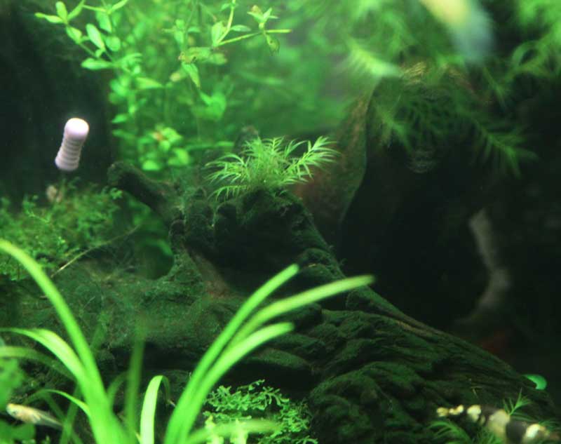 Добавлено немного мхов и других растений. Появилась новая коряжка "японского" дерева. Пока придавлена камнем. Фото не хочет передавать ее паукообразность, по жизни она очень интересно выглядит. Когда утонет - начну к ней мхи приращивать. В левом аквариуме появилась живность - черрики. В правый аквариум досыплю наверное еще ADAвского грунта, чтобы уклон к задней стенке был более явным.