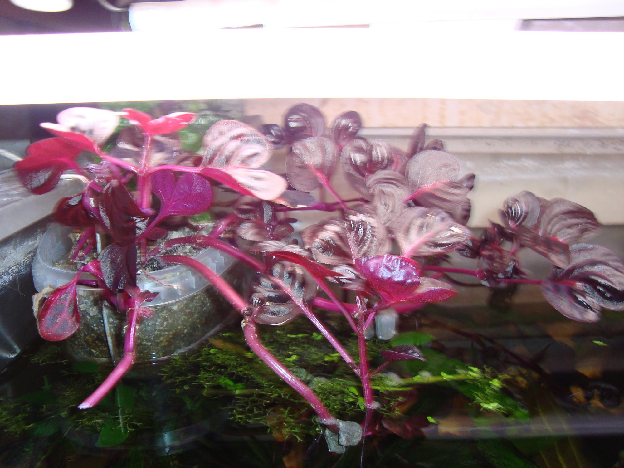 Лично мне нравятся открытые аквариумы с высовывающимися над водой листьями эхинодорусов,лимонников,да вот беда,в надводном состоянии они все зелёные,а тут такая альтернатива.