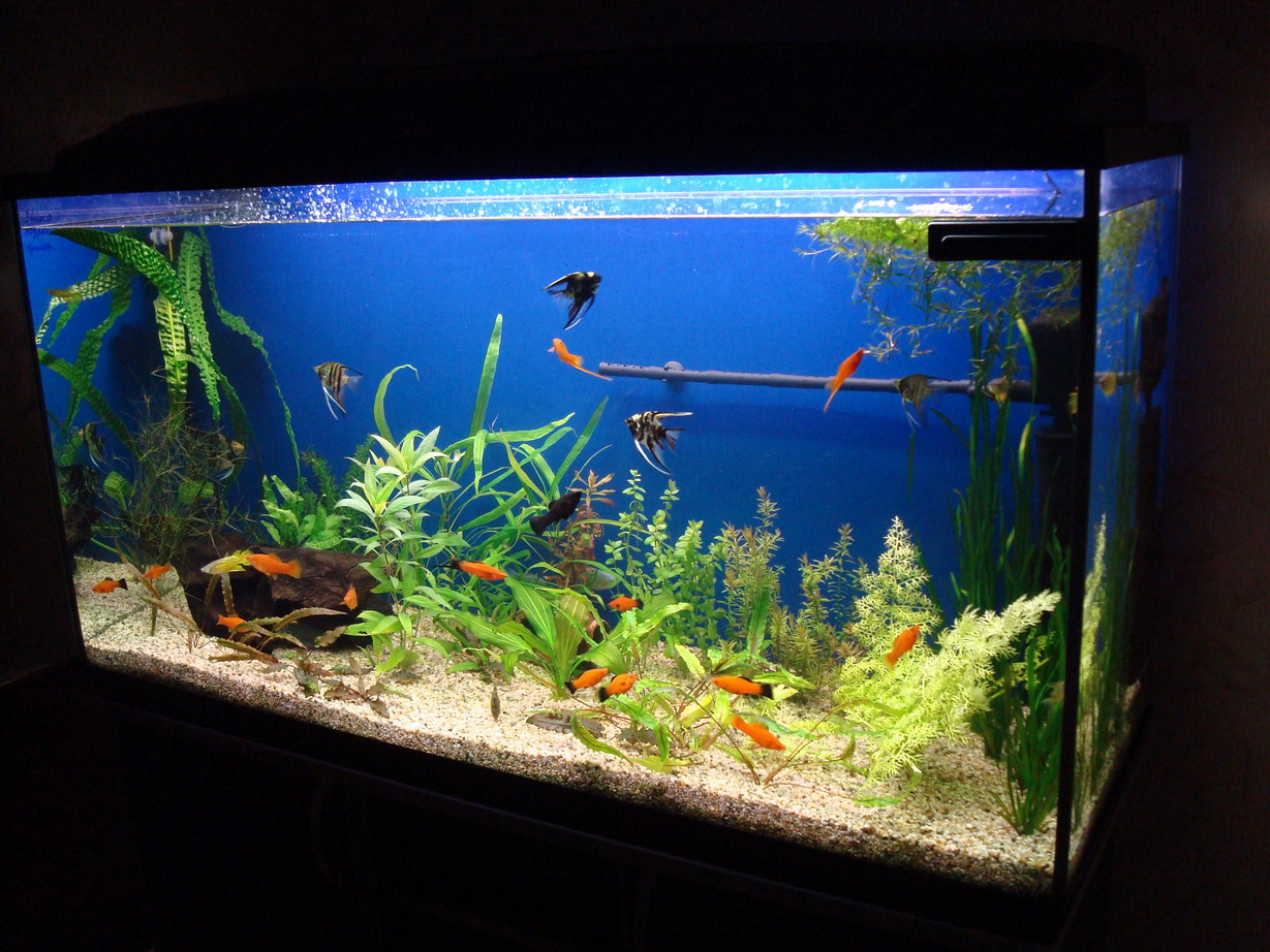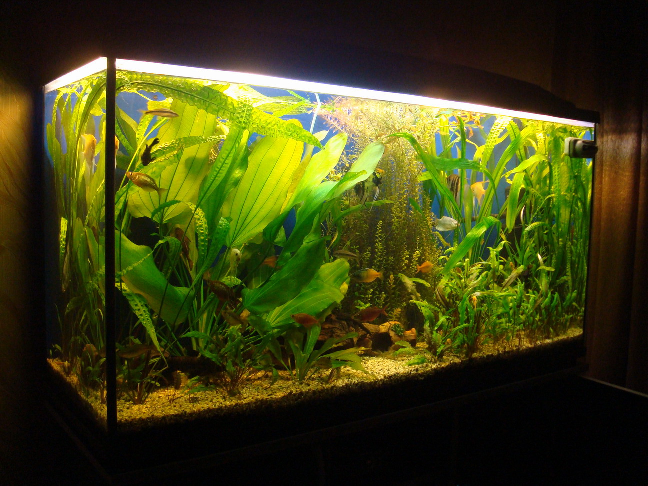 Аквариум 300 литров, запущен в марте 2010 года. Дизайна никакого, ну никудышный из меня дизайнер, что ж тут поделаешь... Изначально задумывался как травник, но при высоте 60 см многие растения не захотели расти, а может вода им не понравилась... Старые фотки почти все поудаляла, много их скопилось, а как свернуть их я не знаю. В общем на сегодняшний момент мой аквариум выглядит так:
