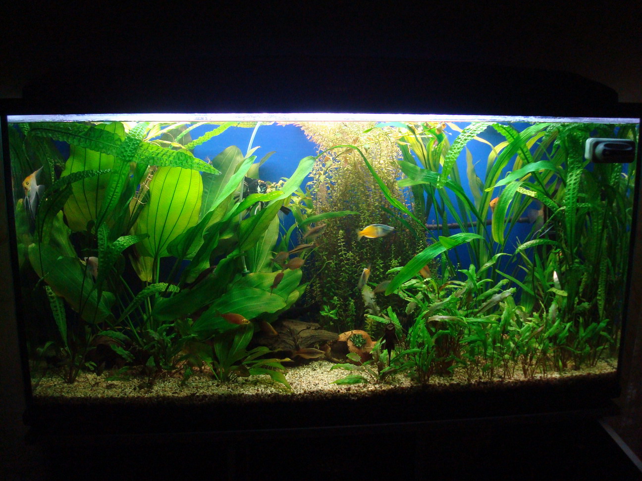 Аквариум 300 литров, запущен в марте 2010 года. Дизайна никакого, ну никудышный из меня дизайнер, что ж тут поделаешь... Изначально задумывался как травник, но при высоте 60 см многие растения не захотели расти, а может вода им не понравилась... Старые фотки почти все поудаляла, много их скопилось, а как свернуть их я не знаю. В общем на сегодняшний момент мой аквариум выглядит так: