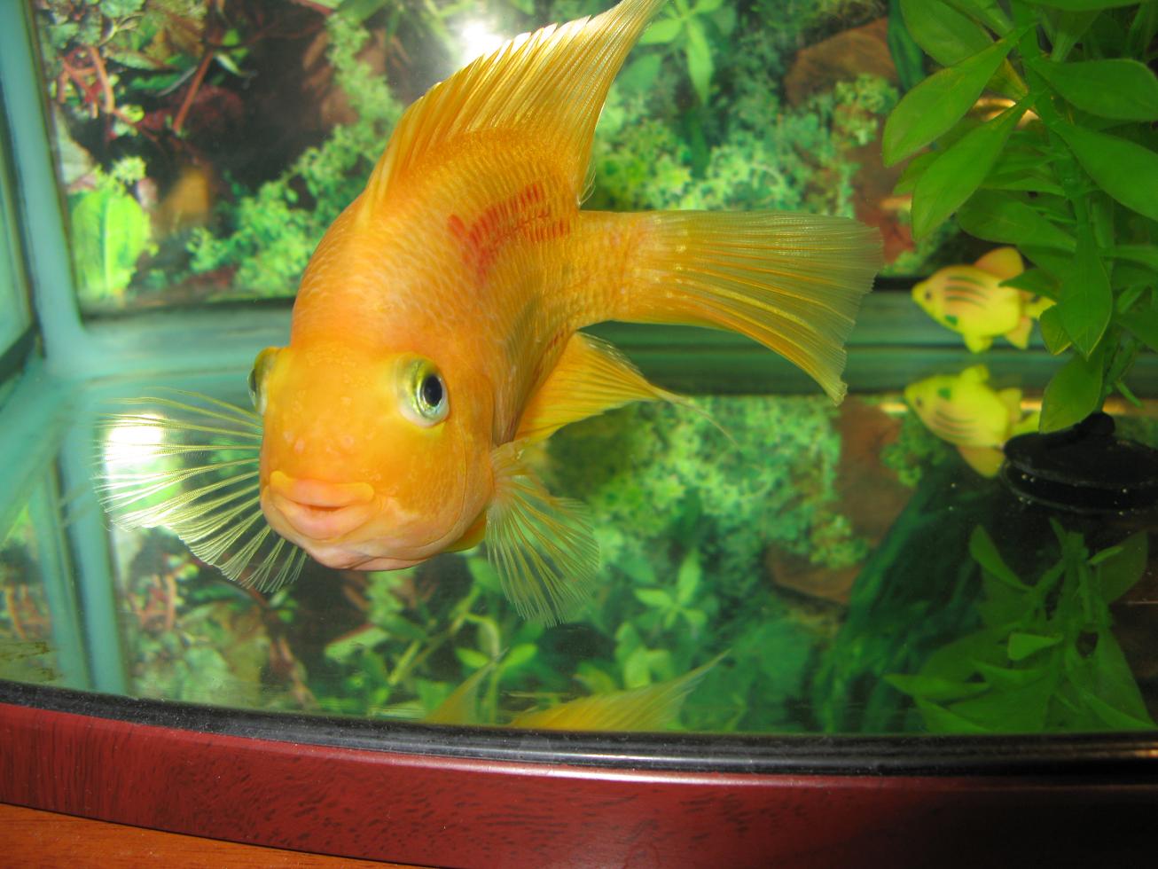 Сейчас хотя и поменяла видовой состав рыбок, но дома решили - попугая оставить, очень смешной и забавный рыб, кусается правда, но это от настроения, ну и глазищами своими красивыми когда смотрит - просто очаровывает.