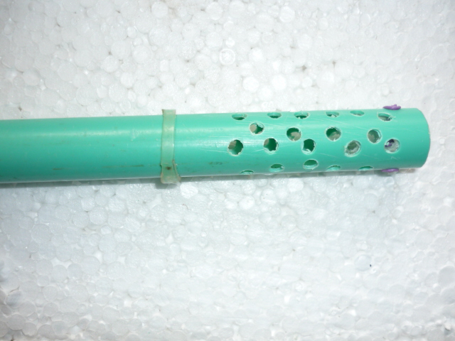 В пластмассовой трубке сверлим отверстия, заглушаем отверстия трубки куском шприца (заглушка нужна для того чтобы щебень не попал в трубку, но об этом ниже) и фиксируем его с помочью палочки от чупа-чупса (рис.6).